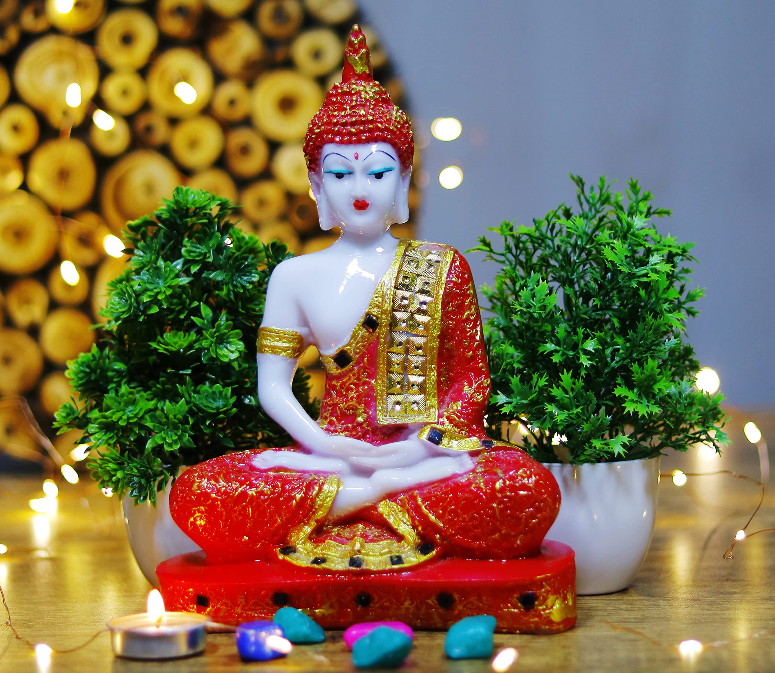HomeHomeSpiritualIdolsGW Creations Polyresin Meditation Sitting Buddha Statue/Buddha Statue Lord Figurine Gautam Buddha Idol Statue Showpiece with Artificial Plant-(Red Golden Buddha) - Set of 3