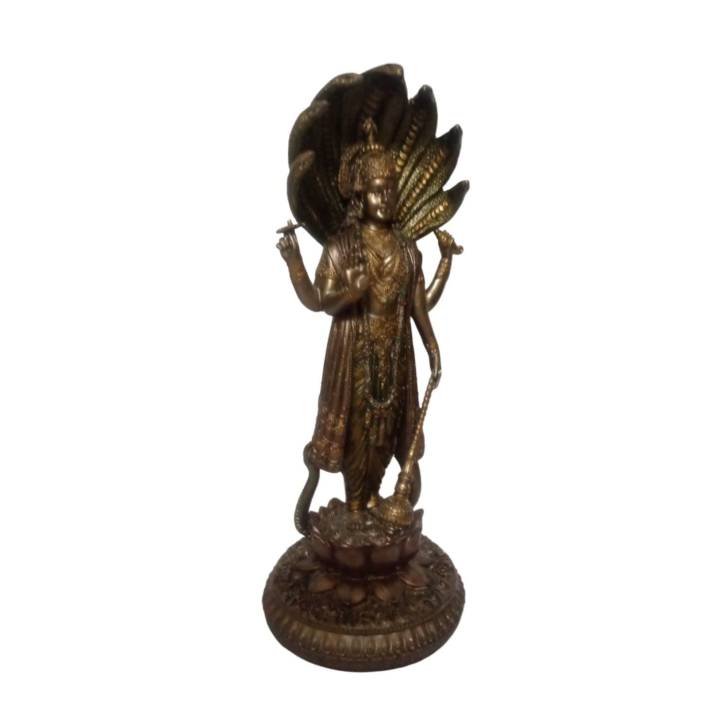 This incredibly detailed figurine Vishnu with Naag of Bonded Bronze Height 12 Inch has been wrought lovingly by the artisan and gleams with the richness of the alloy finish that is imparted to this splendid idol.