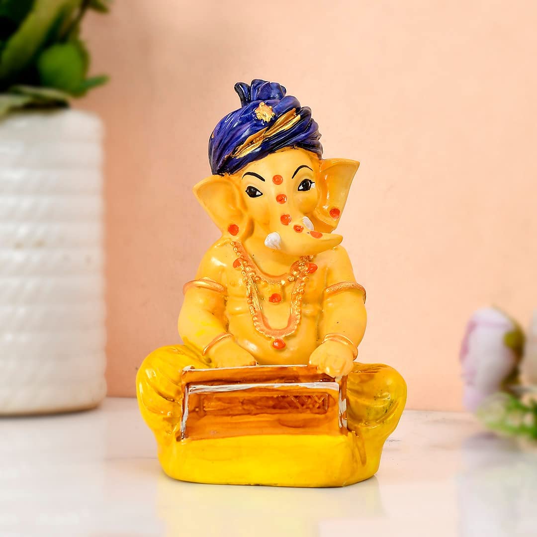 KHURJA POTTERY Ganesha Idol for Home Decor Ganesh ji murti with Harmonium Statue for Home and Office Decor Yellow 5.5 Inch
