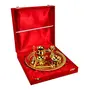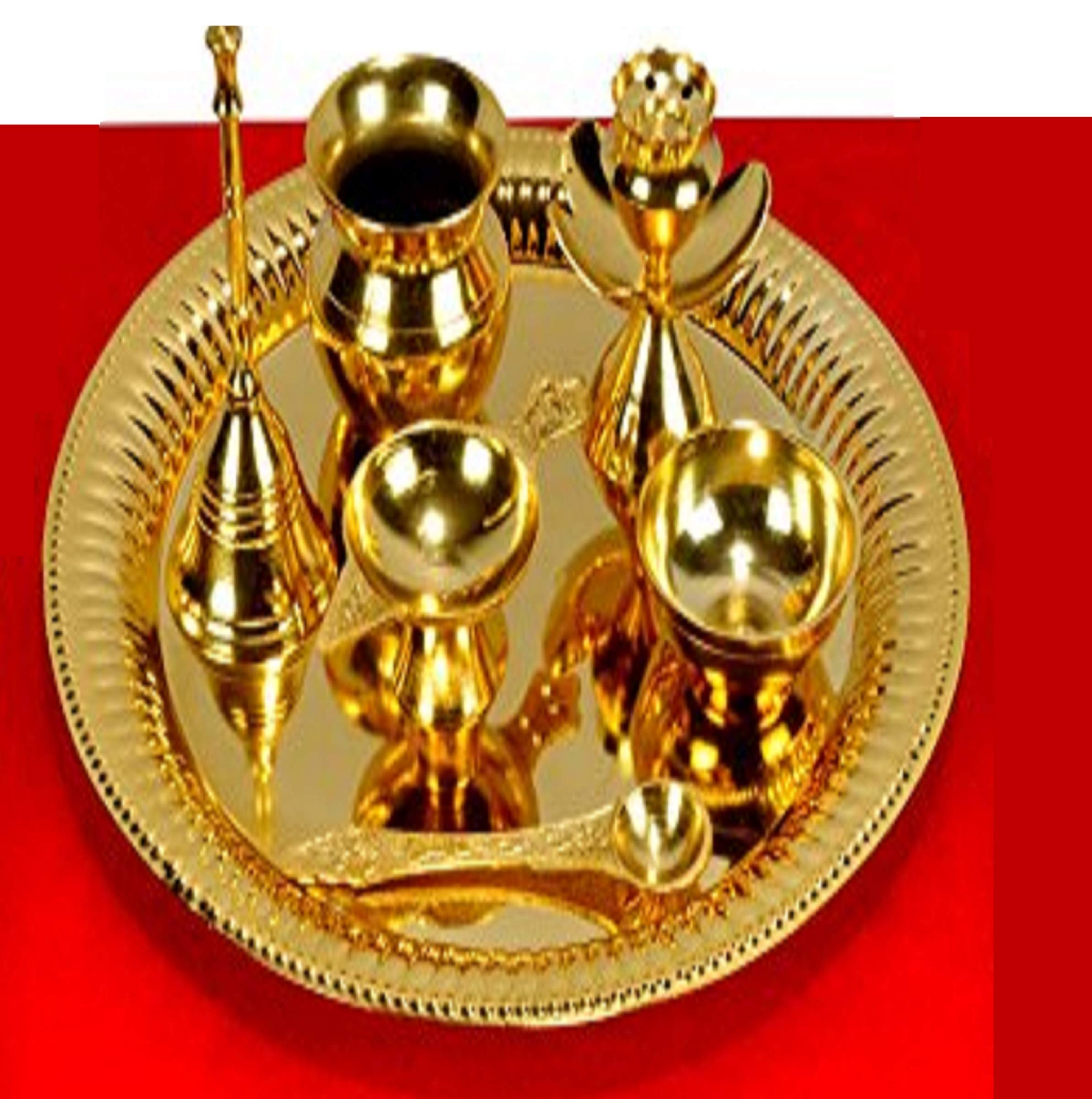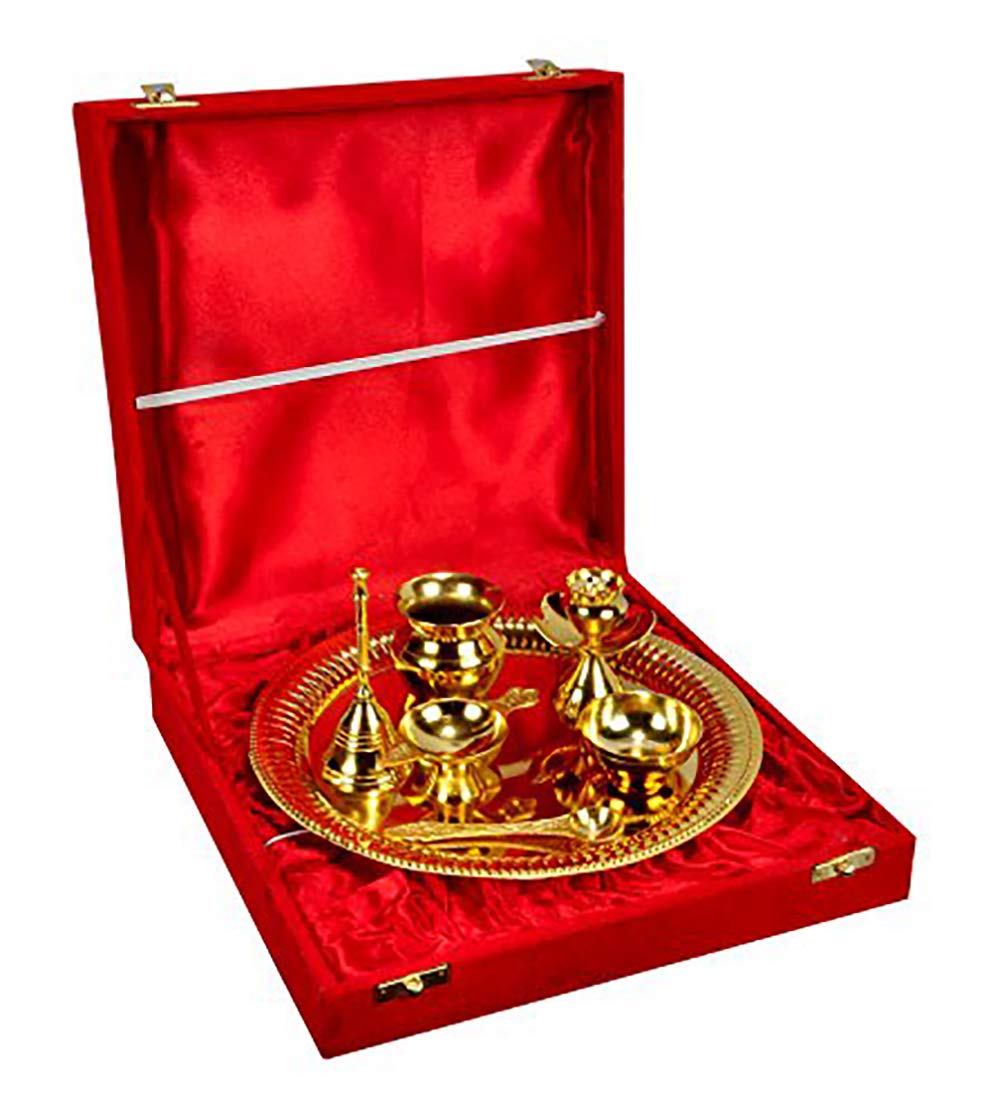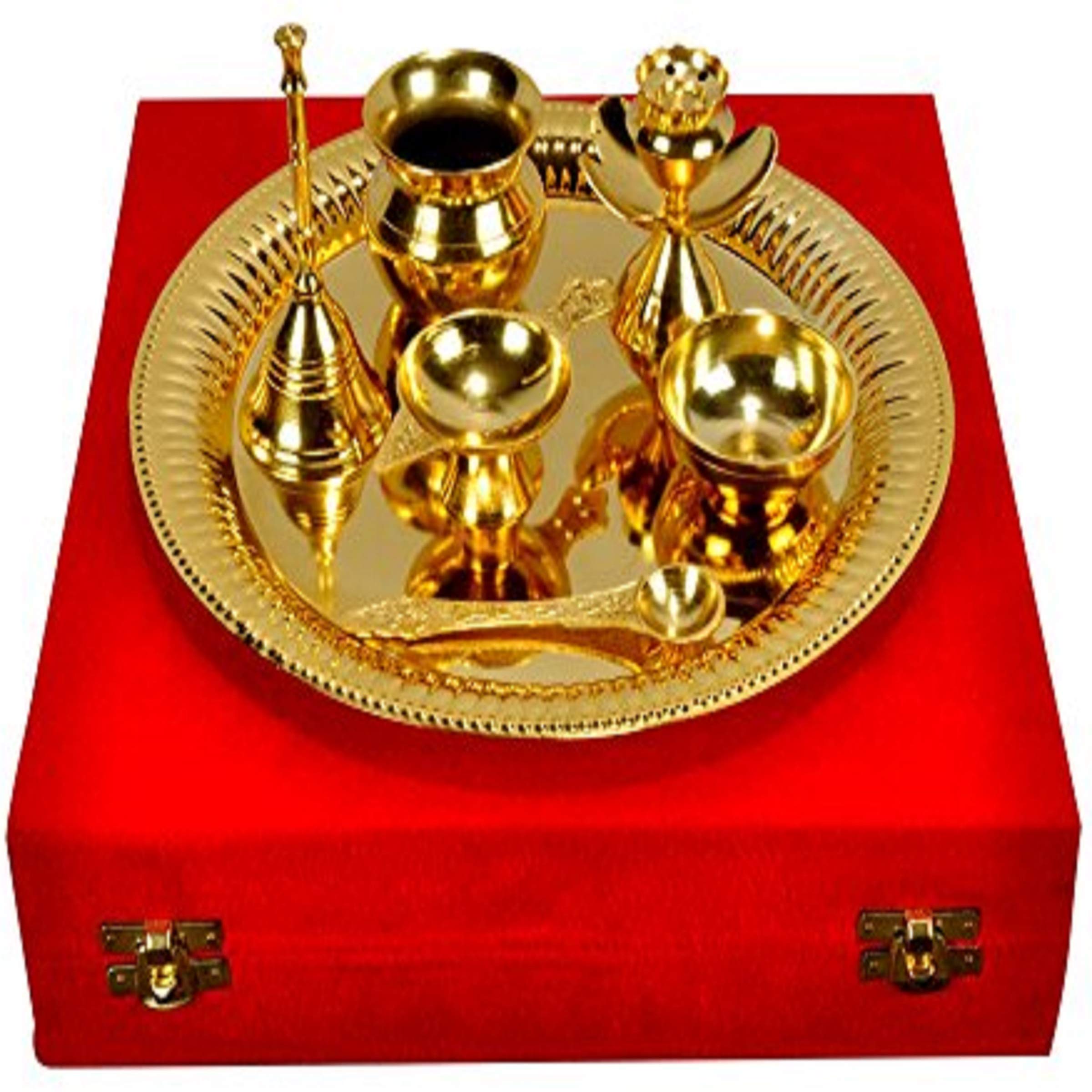 Anand Crafts Silver & Gold Plated items have antique designs. The item is highly durable elegant and a wonderful addition to your Home Decor. It comes in a Fancy red/blue colored gift box and can be readily turned into a wonderful Anniversary Wedding Diwali Valentine gift item. CARE TIPS Dusting - First use a soft brush or clean cotton cloth to dust. Removing Candle Wax - Candle wax can be removed from a silver holder by simply running hot water over the area containing the wax. The softened wax should be easy to pry out with a finger. Never risk scratching the piece by using a knife or other sharp object. Washing and Drying - Once all dust and wax are removed wash the item by hand with warm water and a gentle dish washing soap to remove any food but don't soak the silver in water for any length of time. Rinse the piece well with clean water distilled is best and dry immediately with a soft lint-free cloth. A hair-dryer set on warm helps to dry hard-to-reach places. After your pieces are clean and completely dry wrap each of them individually with acid-free buffered tissue butter paper or washed cotton linen or polyester to store. Do not use woolor newspaper which can cause excessive tarnishing that will be difficult to clean or even worse can remove silver plating. Safely Display Silver Plated items in Your Home - If you'd like to display your silver plated items rather than storing it a glass-enclosed cabinet makes a good choice. Avoid unvarnished wood shelves that can omit harmful vapors and can cause tarnishing.Glass shelves are preferred over wooden shelves.You'll have to avoid displaying or storing silver near cotton felt wool or velvet as well. Gold Plated Steel Pooja Thali 11.5" Diameter with Brass Bell