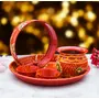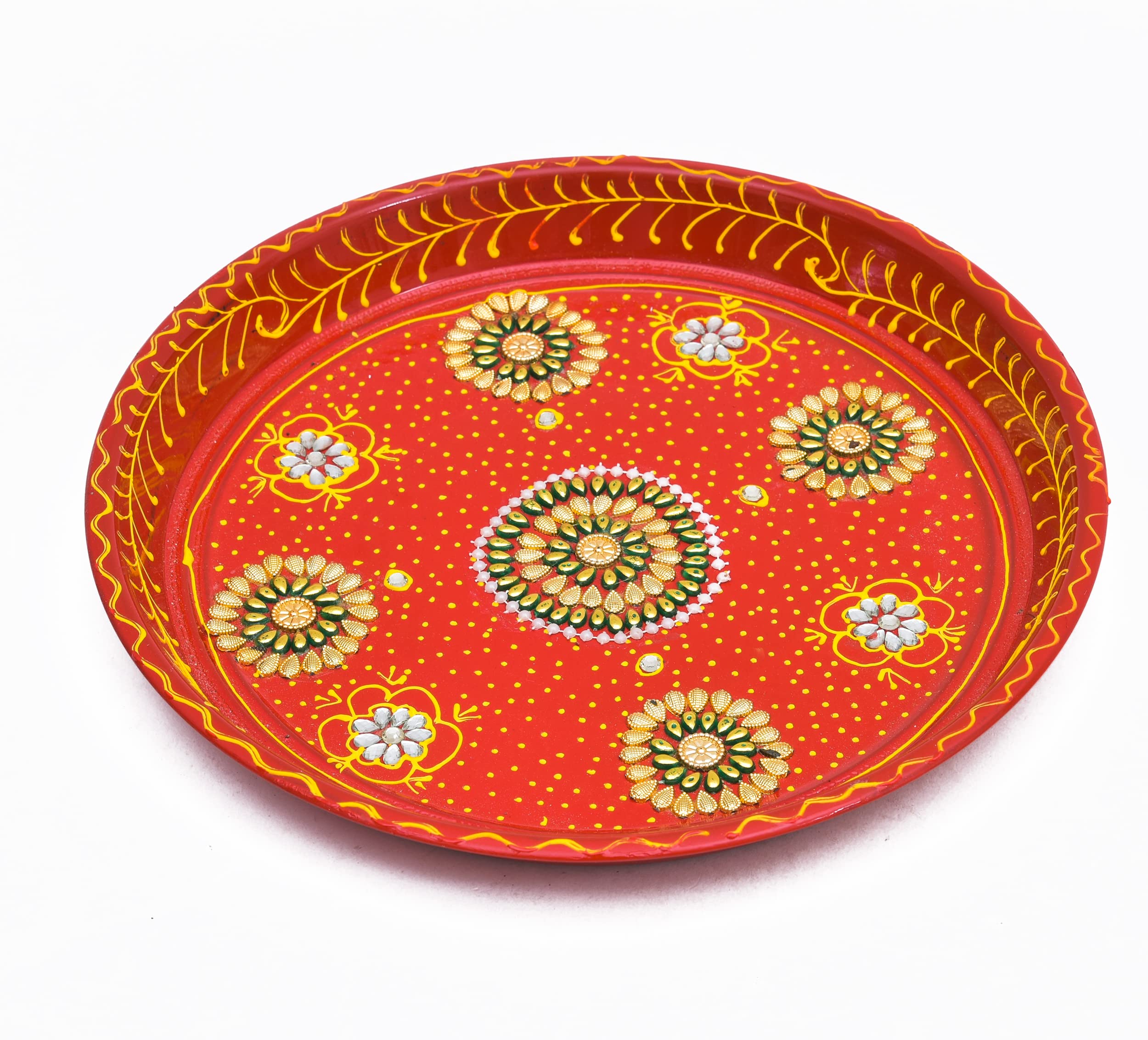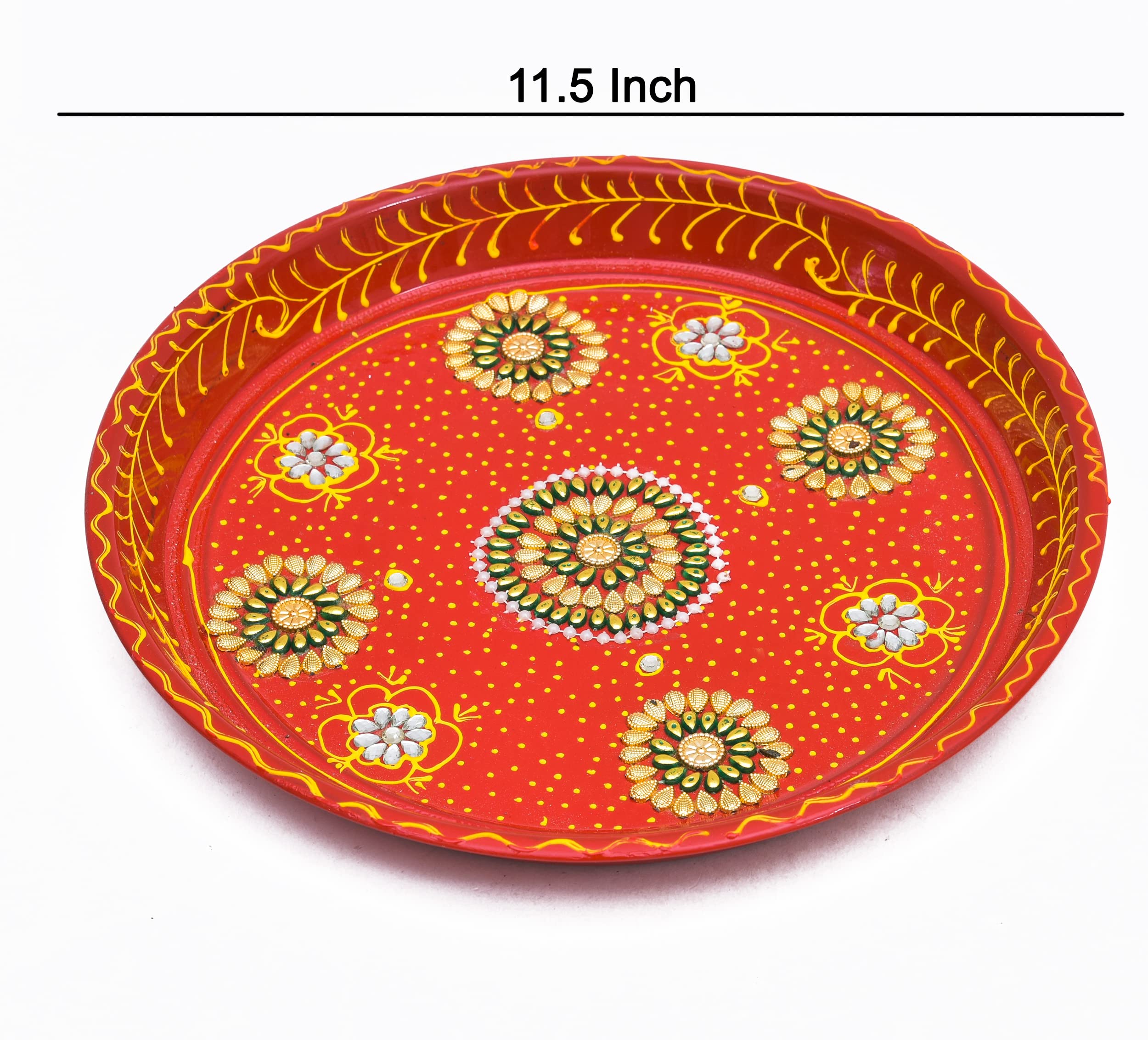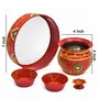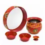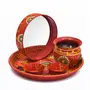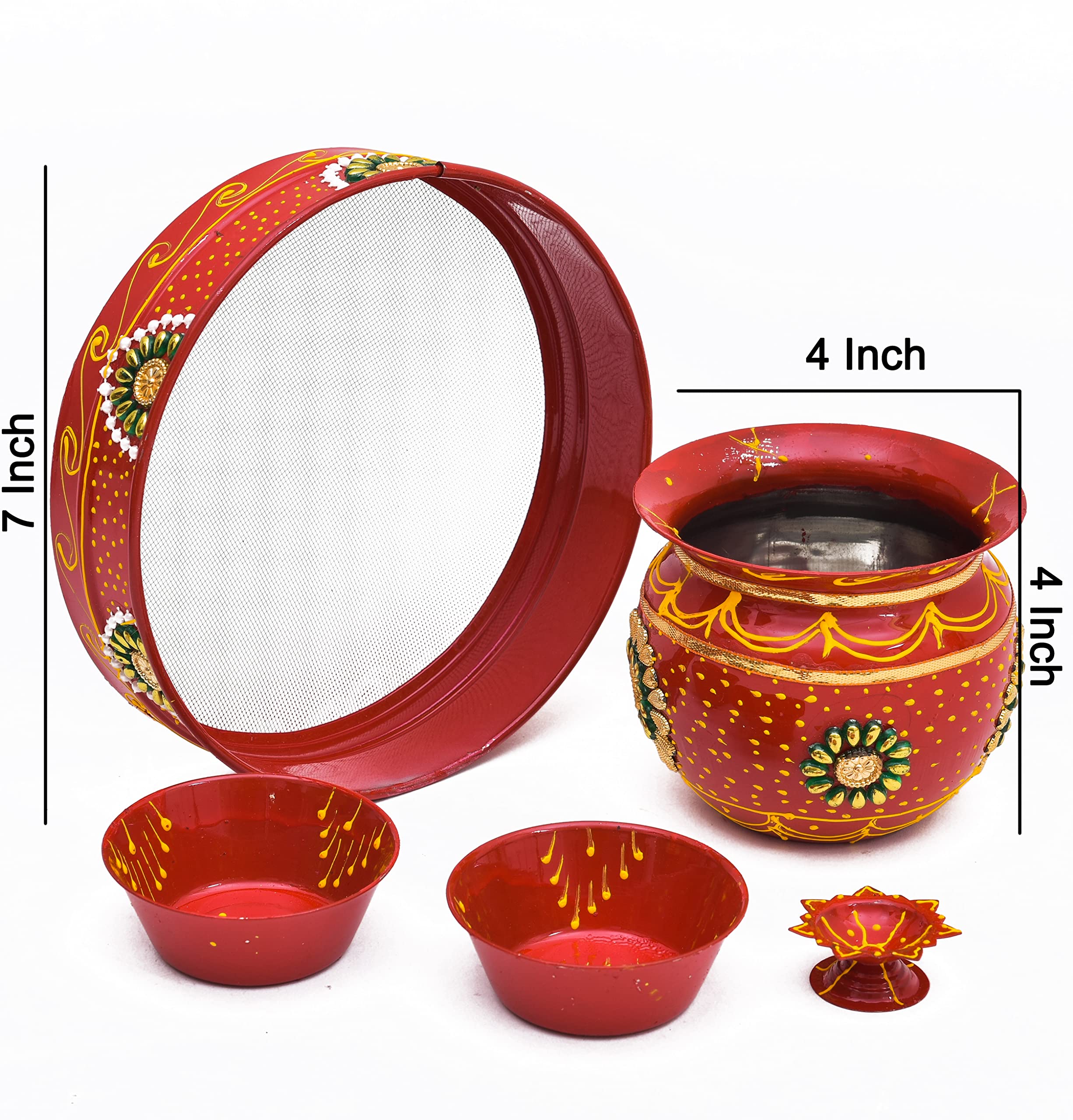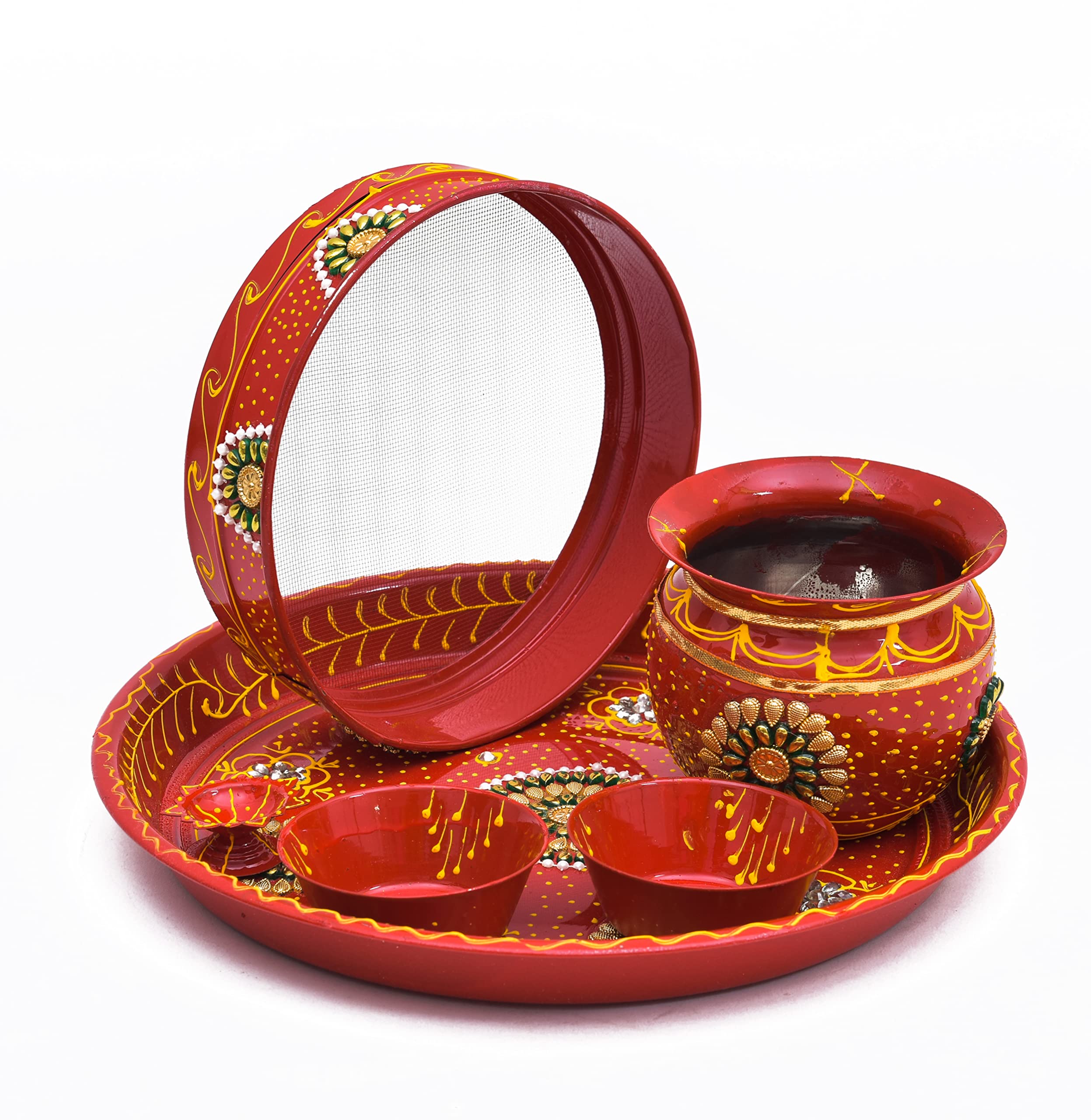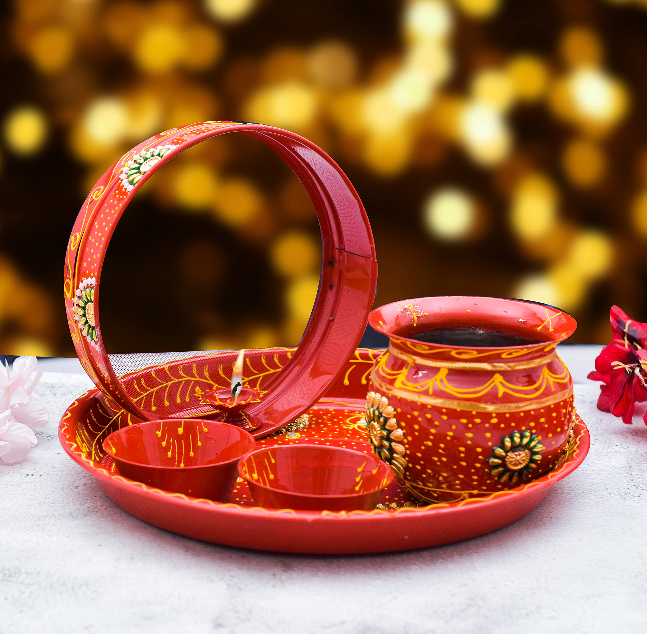 Karwa Chauth Puja Samagri Kit offers an exclusively handcrafted designer thali chalni kalash and a diya. Puja is a prayer ritual performed in the morning by Hindus to offer devotional worship to one or more deities or to spiritually celebrate an event. Puja is the act of showing reverence to God through invocations prayers songs and rituals. It is performed either by individuals or by groups and either directly by a worshipper or indirectly by a priest on behalf of the worshipper.According to the Hindu calendar Karwa Chauth is celebrated on the fourth day after Purnima in the month of Kartik. On this day married women dress up in new clothes (preferably red which signifies a happy married life) and apply mehendi and shringar ka saam as a part of the festivities.
