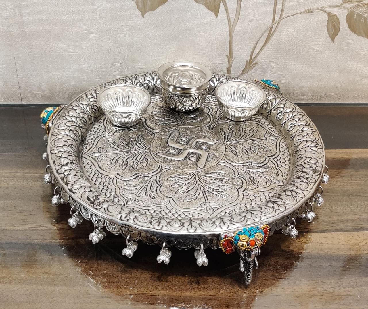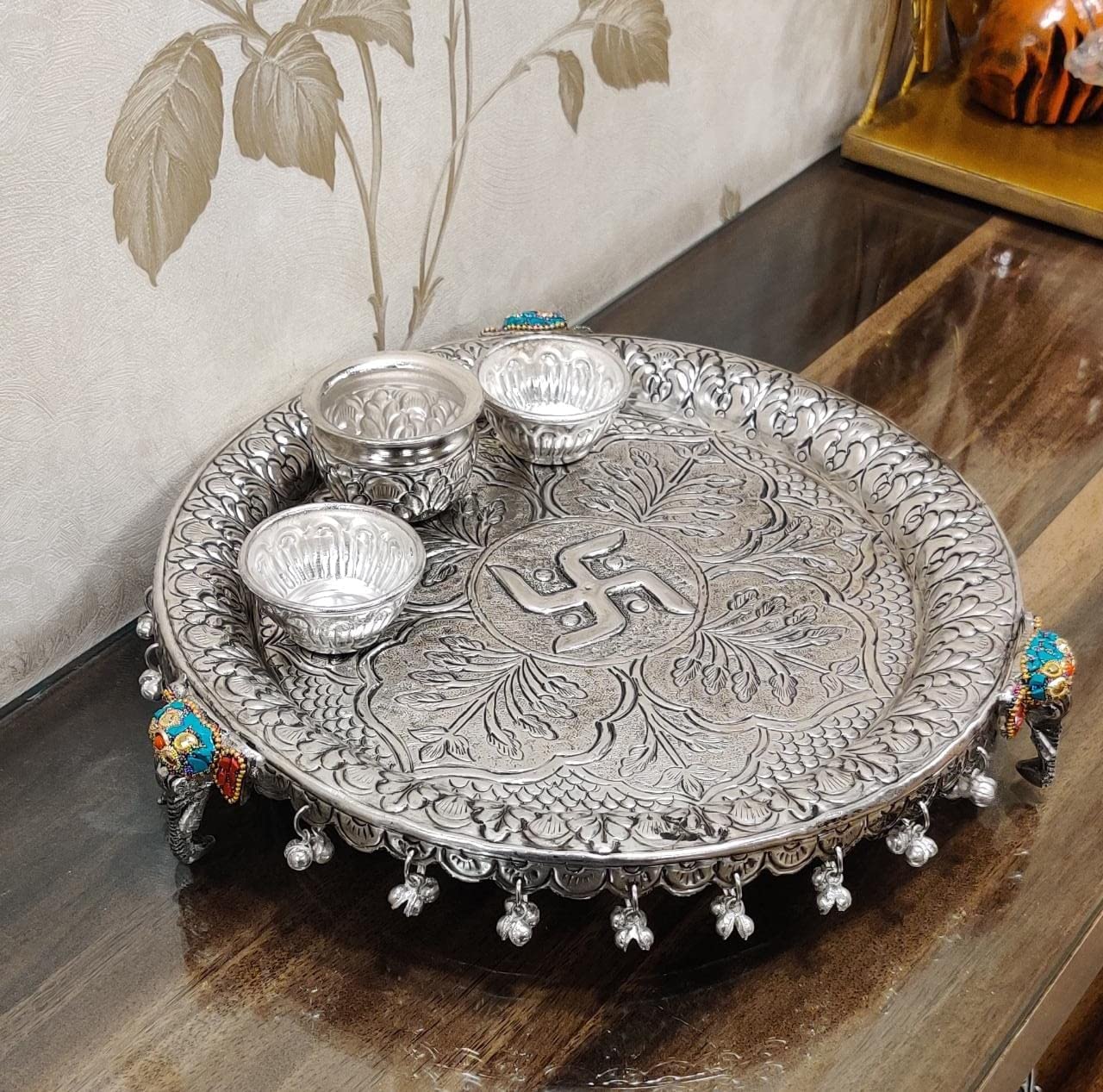 Traditional German Silver Coated Pooja Plate Set Every human being wants to have a Spiritual Connection with their Almighty and Prayer is the best way to have that Spiritual Connection. We try to make those prayers auspicious and as traditional as possible. Product Details: The Pooja Set is made of German Silver Coating and consists of all traditional items used in the Pooja. Benefits: German Silver is one of the materials that humankind has been using for some time. Keeping its benefits in mind and with advanced technology Usage: This Plate Set can be used while performing different Poojas on different occasions like Rakhi Karwa Chauth Diwali Pooja and other Pooja's. Cleaning: For cleaning use a soft sponge and liquid soap. German Siler will maintain its Glossiness. Preservation: German Silver is the friendliest metal in the environment and is easy to recycle making it the greenest natural metal. To make its life longer always dry them after washing with a cotton cloth and keep them in a dry place. If items are not in use store them at a dry place in a dry plastic bag.