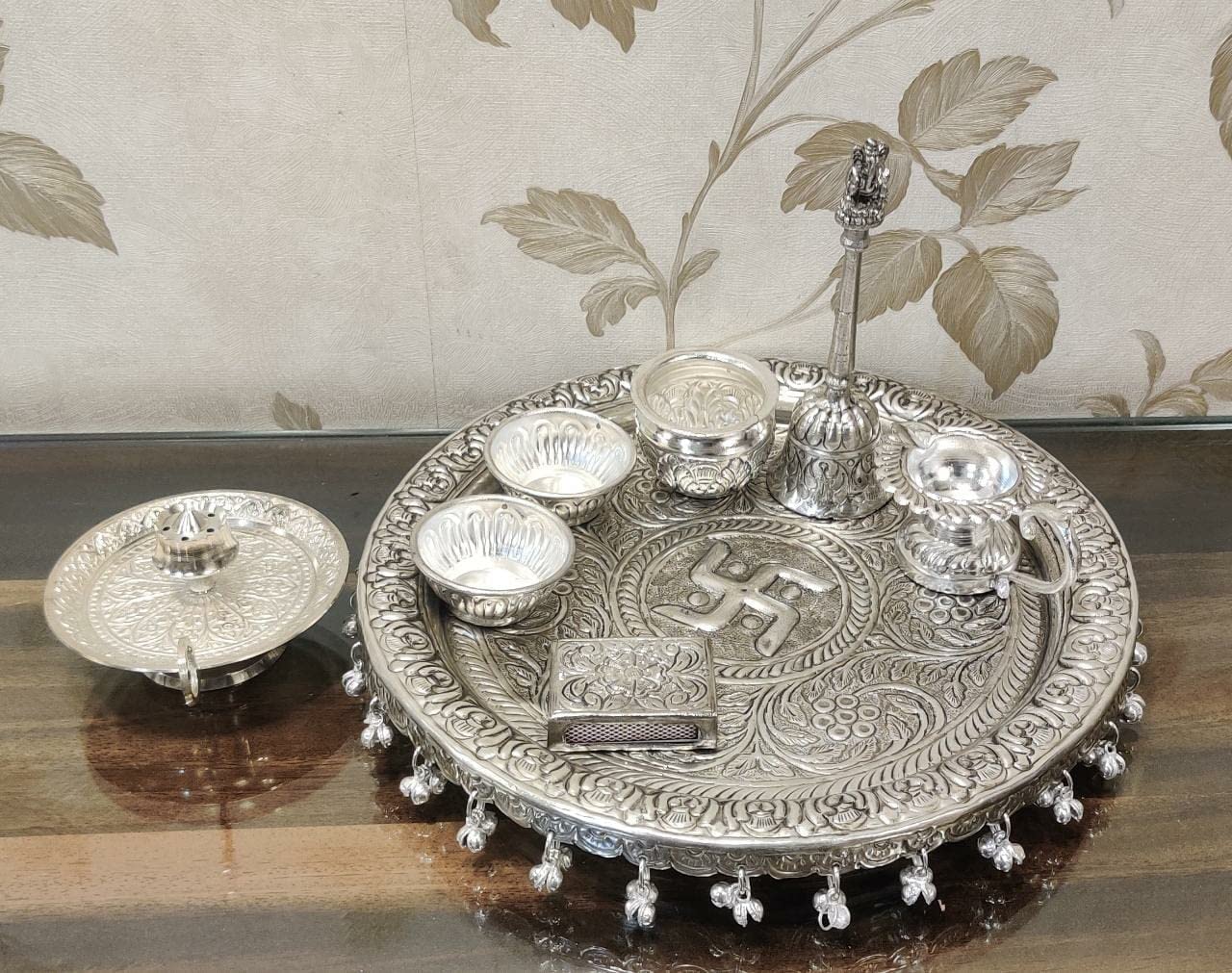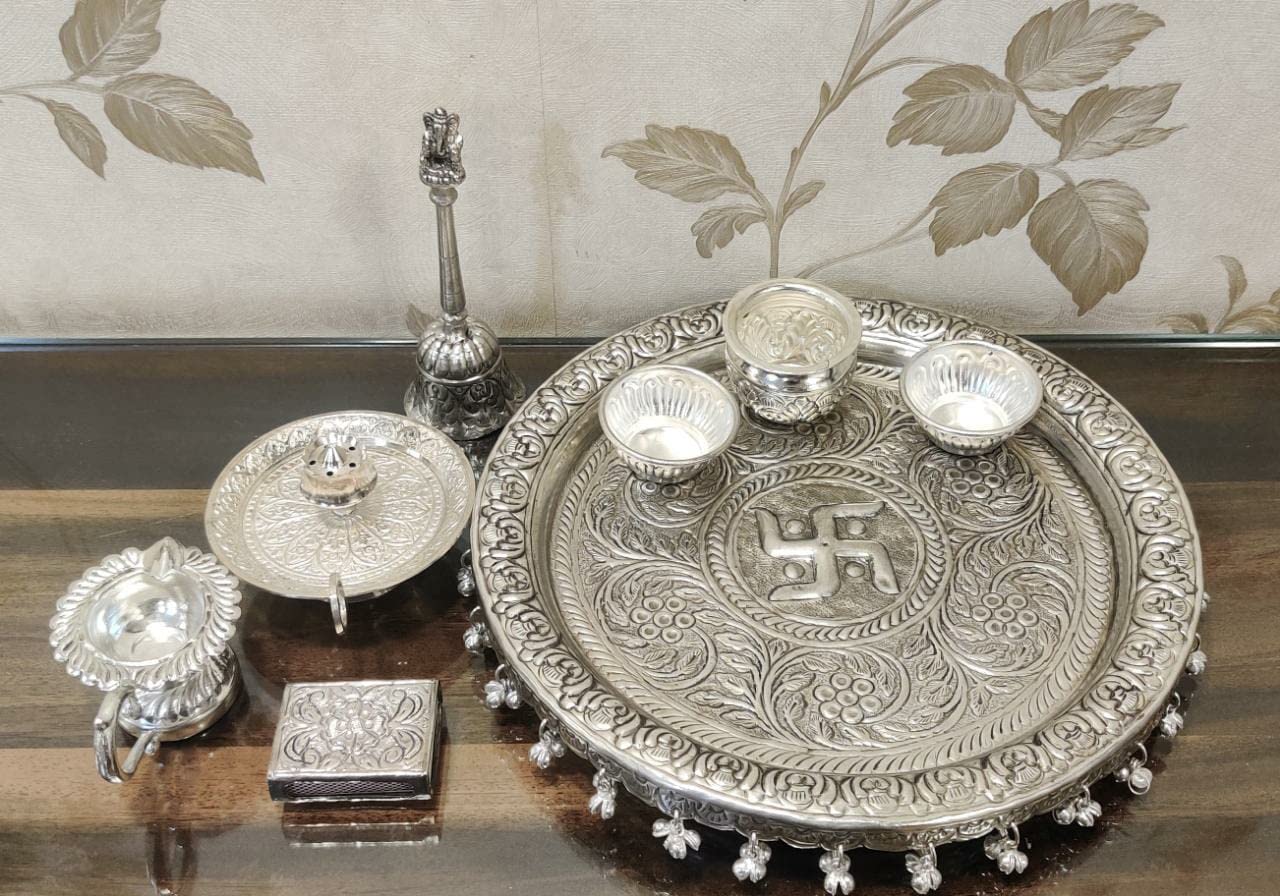 Traditional German Silver Coated Pooja Plate Set Every human being wants to have a Spiritual Connection with their Almighty and Prayer is the best way to have that Spiritual Connection. We try to make those prayers auspicious and as traditional as possible. Product Details: The Pooja Set is made of German Silver Coating and consists of all traditional items used in the Pooja. Benefits: German Silver is one of the materials that humankind has been using for some time. Keeping its benefits in mind and with advanced technology Usage: This Plate Set can be used while performing different Poojas on different occasions like Rakhi Karwa Chauth Diwali Pooja and other Pooja's. Cleaning: For cleaning use a soft sponge and liquid soap. German Siler will maintain its Glossiness. Preservation: German Silver is the friendliest metal in the environment and is easy to recycle making it the greenest natural metal. To make its life longer always dry them after washing with a cotton cloth and keep them in a dry place. If items are not in use store them at a dry place in a dry plastic bag.