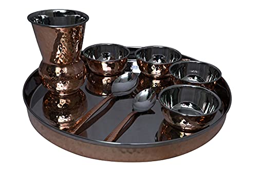 This is a dinnerware thali plate set consists of 1 plate (Thali) 4 bowls 1 tumbler 1 dessert spoon 1 fork and 1 knife. In India most of their dishes are served simultaneously in a thali. A thali is a round platter with an eared rim. Entire meals can be served using this simple plate. The thali is generally made with steel or copper. Other dishes served on a thali include vegetables yogurt chutney and pickles. In restaurants vegetarian or meat-based thalis can be served. Thali is delightful ways to enjoy Indian cuisine. It serves a balanced meal in itself and the flavors are so well rounded that palates will certainly be satisfied. Care Tips:- Clean your copperware by hand and avoid dishwasher as the detergent can cause oxidation leading to permanent damage. Use a solution of equal quantities vinegar or lemon juice and salt diluted with some water at such times but don't use it regularly. Also avoid scratchy cleaners like steel wool. A simple soft cleaning liquid on soap base hot water and a soft washing cloth is best for daily use.