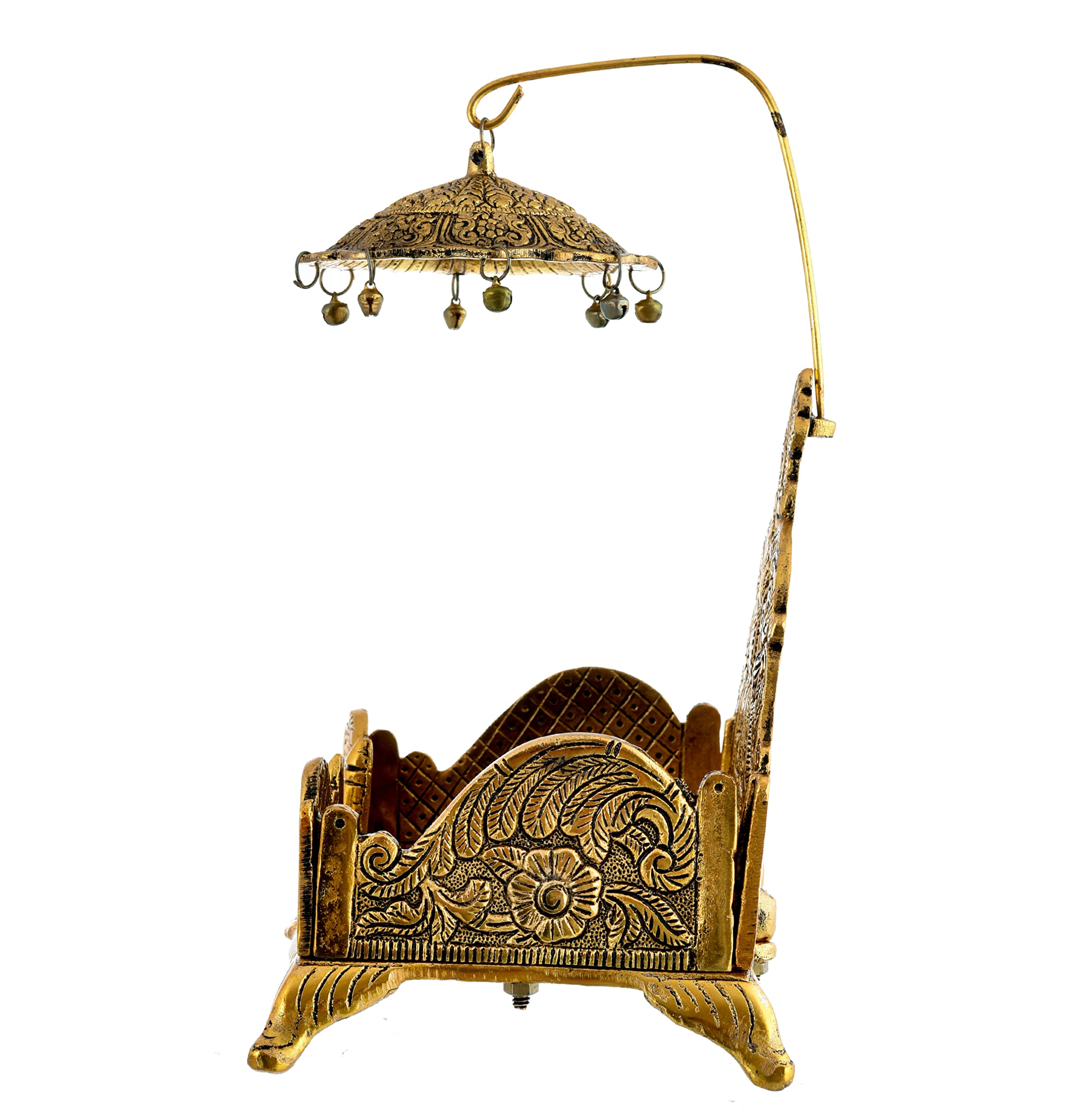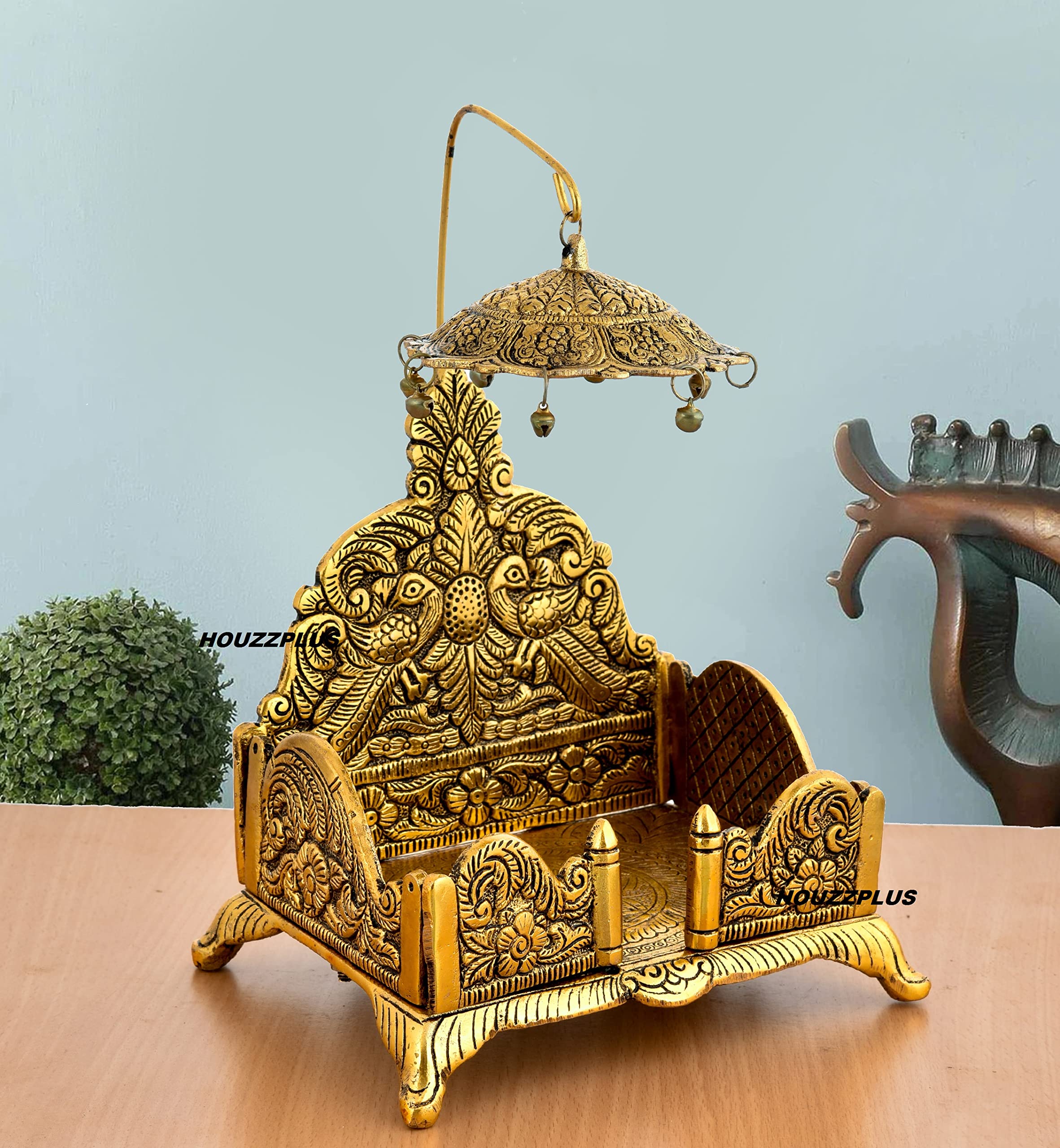 This beautiful and innovative designer singhasan is an amazing piece of art. The throne is made of beautifully carved peacocks. The idols of gods can be placed on it and the chhatra is there to cover the idol. It is a very beautiful piece to be kept in any pooja room. It is an elegant and different piece. It can be the best gift to your friends and relatives on all occasions like birthdayshousewarming gifts etc. As it is handmade slight changes in colour and design might vary