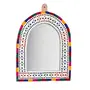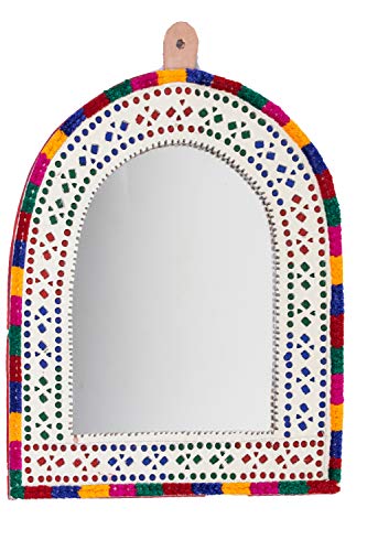 Ethnics of Kutch Leather Art PUNCH WORK Handicraft Mirror. Made out from the pure leather pattern is hand punched into leather sheer. Designed Punched Leather is Stitched on a board covered with beautiful vivid coloured patchworked cloth in back ground. Made out in vivid pattern this Cut Work Leather Art is mastered by artisans of Kutch over the generations. This Leather Craft Mirror is very unique piece of art as it requires very trained hand to produce beautiful designs without aid of machines and requires variety of punches to produce them. This Kutch Handicraft Decorative Art will is perfect piece for your own ethnic India Art collection or gift