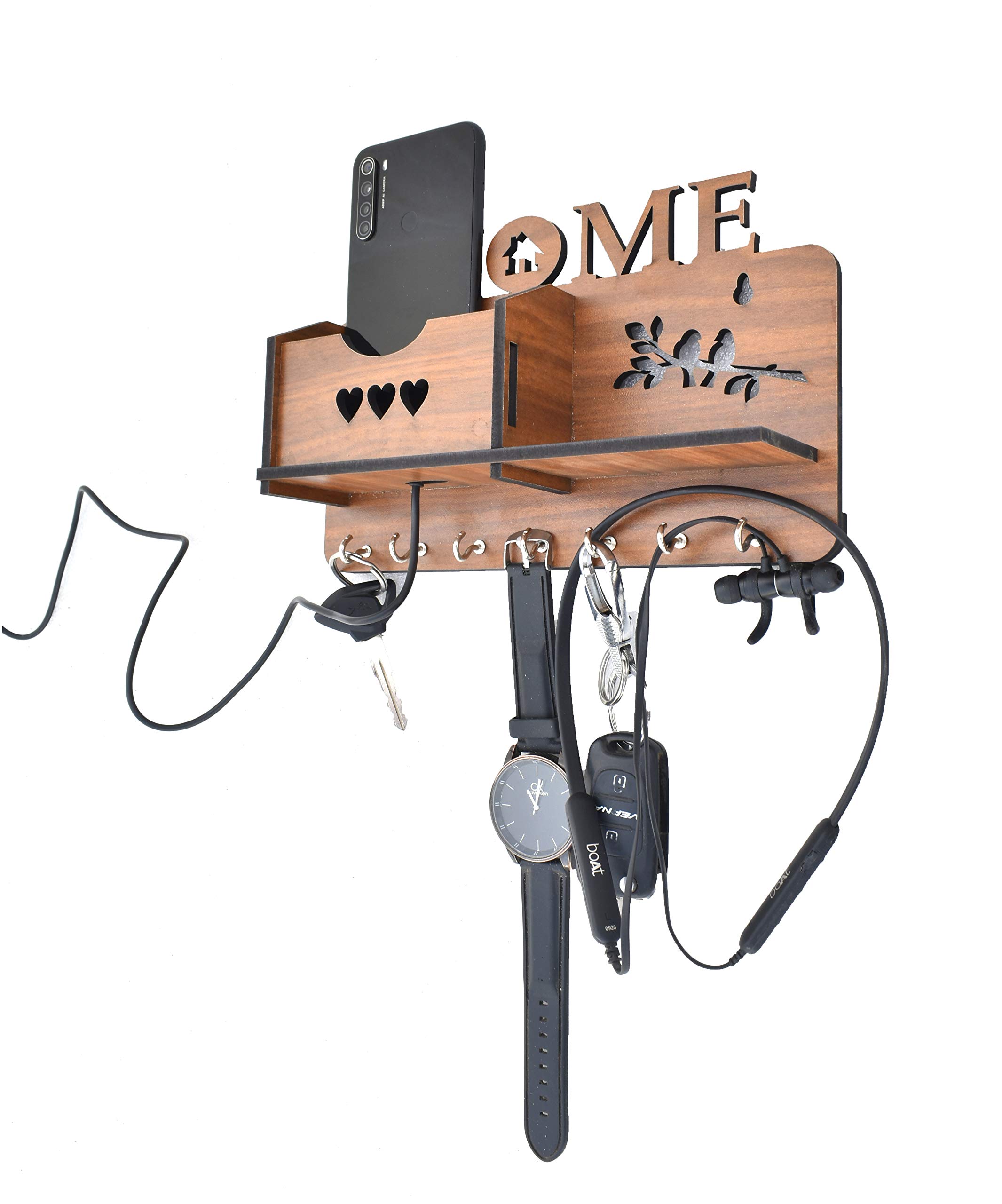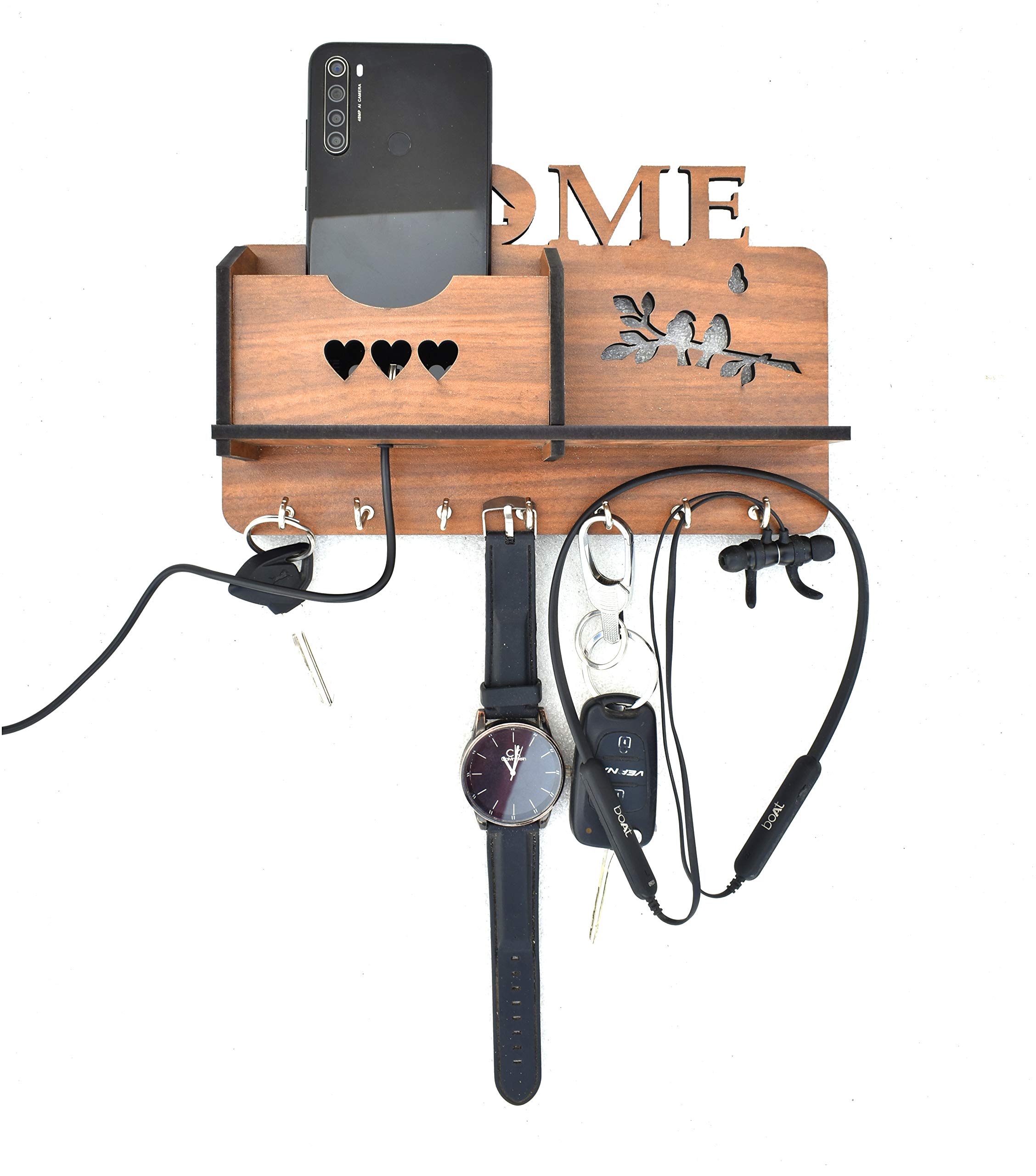 DecorDen Wooden Wall Shelf/Key Holder Cum Mobile Stand with Hooks for Home Office Door. Key Stand Holder (American Teak)