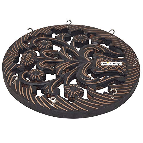Stylish and Durable Key Holder Keep all your keys in one place with Desi Karigar wooden wall key holder. Made from high-quality Engineered wood this key holder is quite sturdy. Featuring intricate floral designs it will lend an ethnic touch to your interiors. Fitted with a number of hooks the key holder can be used to hang more than one set of keys. It can be effortlessly mounted on a nail on any wall of your home. Its deep rich colour also allows you to use this holder as a simple wall decoration. Hand-crafted and Exotic Desi Karigar wall hanging key holder will add a touch of elegance to the decor of any room. The finish on this wooden key holder is designed to complement the rest of your furnishings. As it is crafted by rural Indian artisans this holder holds an exclusive appeal and will add its own unique charm to your home. This holder will keep your precious keys out of the reach of children and pets. It can also serve as a good gifting option for an art deco lover. Brand: Desi Karigar Colour: Black Material: Engineered wood Crafted by rural Indian artisans