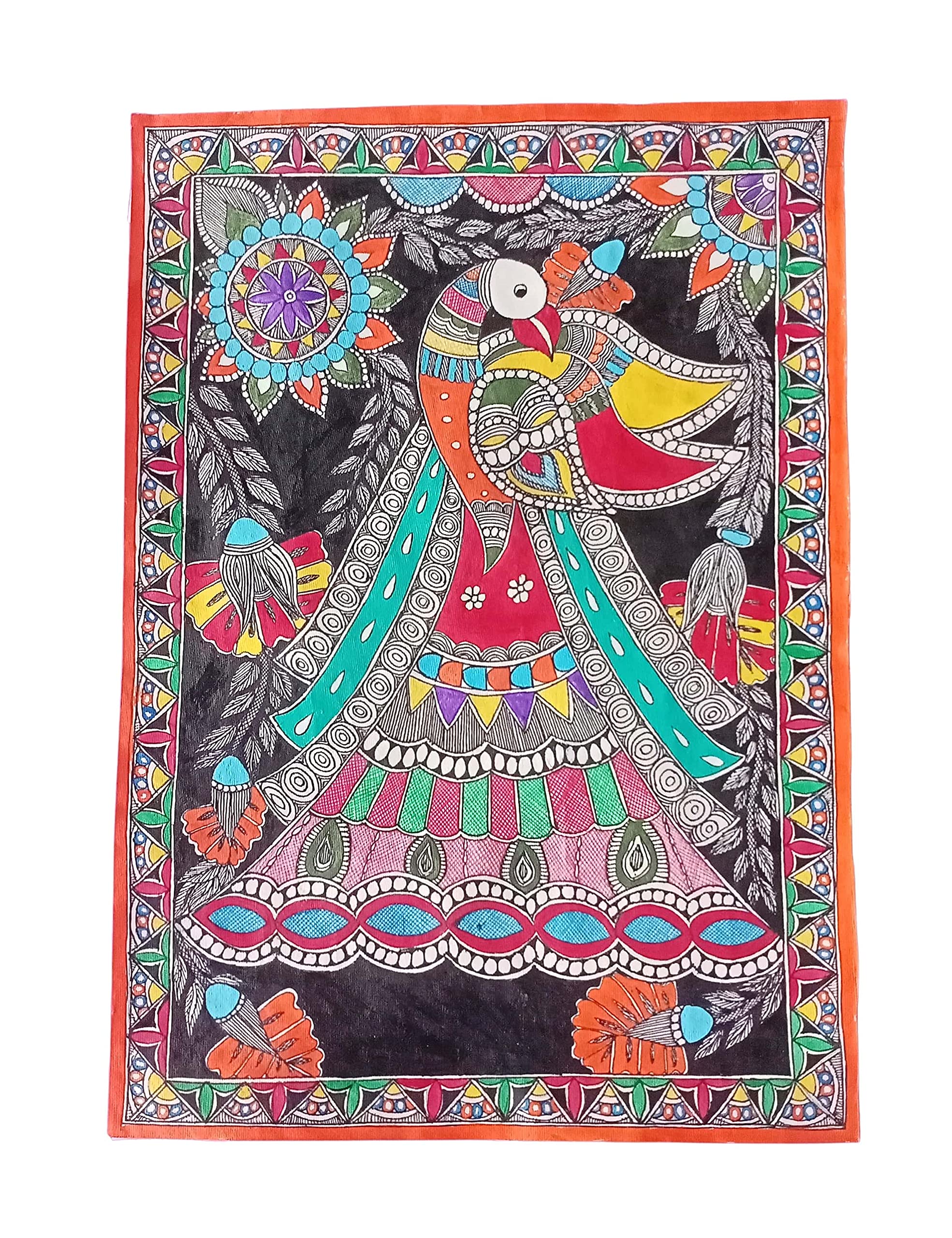 MADHUBANI PAINTINGS Mithila Painting-Madhubani Painting Of Peacock -Fully Handmade(16X11.5 Inch)-Unframed Multicolor