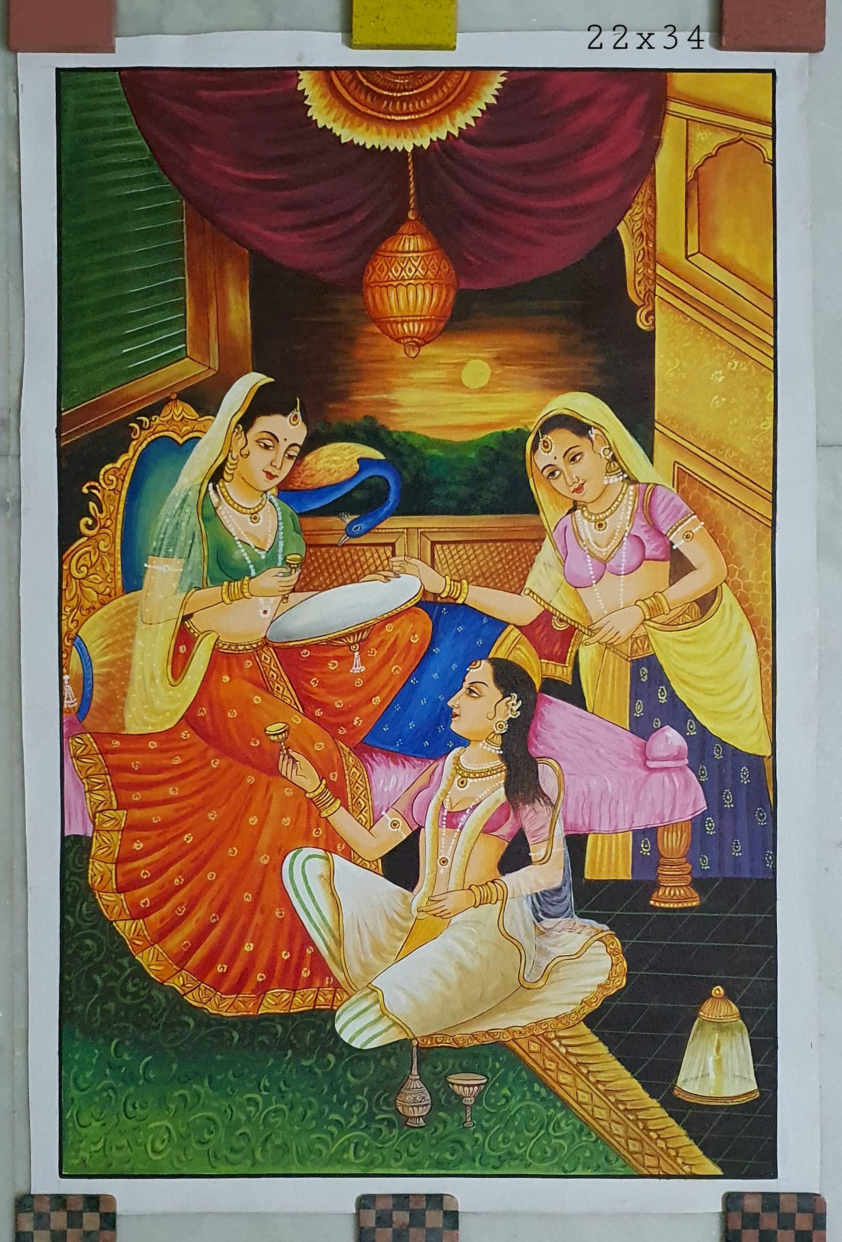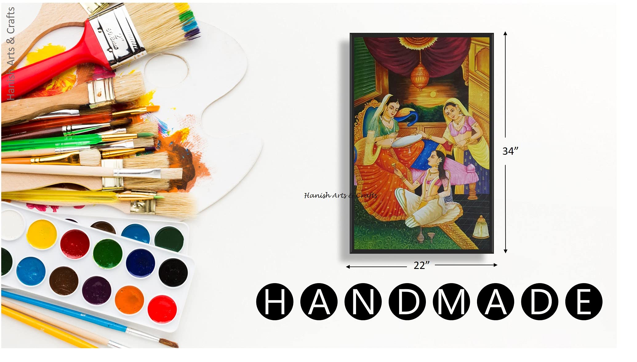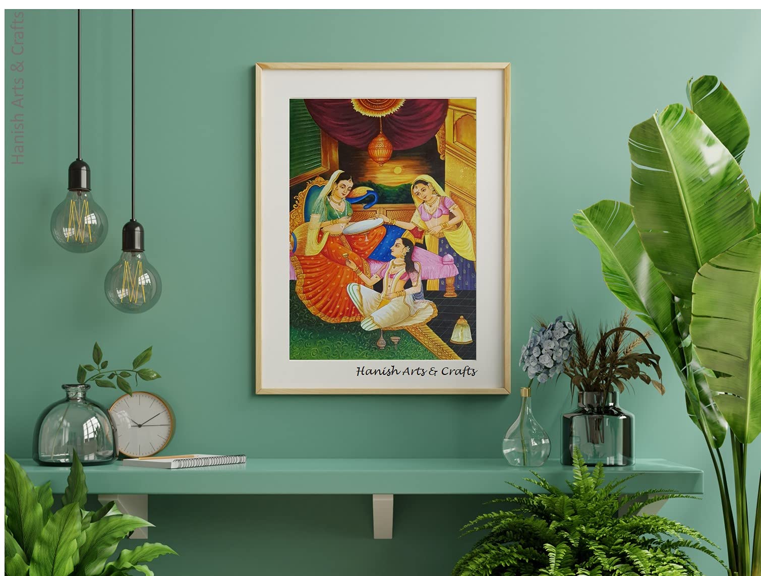 This is a hand painted original painting on canvas. In the upcoming marketplace wall paintings are setting a new trend. With the range of designs colours and sizes we offer you the best of quality. To enhance the decor of your house is our priority. So we even customise designs as per client needs. We have a wide range of more than 500 designs which come with different packaging. The packaging in itself is very creative to make it a hassle- free job of gift wrapping. So order as per your requirement in single piece or sets we offer. The diversity of designs assists you to decorate these in your Living room Bedroom Kitchen. PICHWAI- PAINTED TEMPLE HANGINGs & Crafts is an art making company which makes paintings on Canvas Paper Silk Cotton Wooden and Stone. We are associated with more than 40 artists who are dedicatedly working for us. Painting is our parental business and we are in this business since four decades. We can provide any kind of customized paintings in any size as per your requirement. Our mission is to unlock the potential of human creativity-by giving a million creative artists the opportunity to live off their art and billions of fans the opportunity to enjoy and be inspired by it.