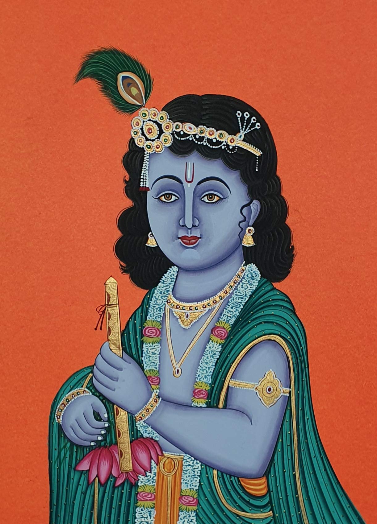 PICHWAI- PAINTED TEMPLE HANGING - Lord Bal Krishna Painting (Handmade Painting 9x12 inches - Unframed) R005. Overview a beautiful painting involves the action or skill of using paint in the right manner; hence the end product will be a picture that can speak a thousand words they say. Arts have been in trend for quite some time now. Hindu mythology portrays him as a prankster a gentle lover a universal supreme being and child-like God. The narrative and stories of Lord Krishna's life are referred to as Krishna Leela. According to the tale Krishna was born in the Yadava clan of Mathura to Queen Devaki and her husband King Vasudeva. You can gift this to a family or a friend. The painting has various forms of certain figures on it as seen in the image. You can add a good set of lights to the place where the painting is and the decor will give a different feel and look to the place. Quality and durability the painting has a matte finish.