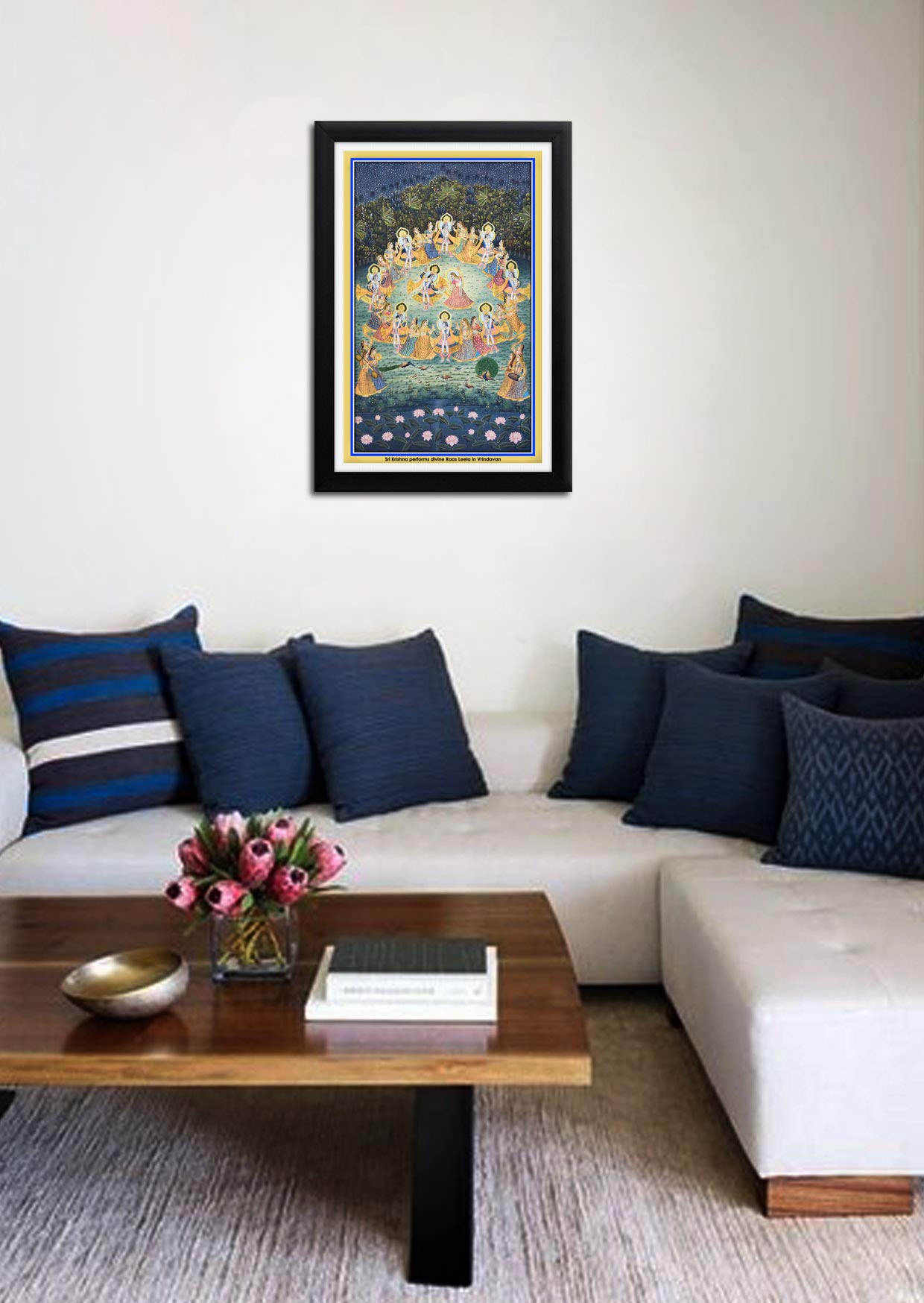 Pichwai is one of the most spectacular ancient & traditional forms of art which originated in the villages of Nathdwara in the state of Rajasthan India. This 400-year-old art form generally depicts and narrates the tales of Lord Krishna's life. The Sanskrit word "Pichh" means back and "wais" means hanging so Pichwais are paintings or hangings which form the backdrop behind the main deity of Krishna temples. The making of a traditional pichwai painting takes a considerable amount of time ranging from a couple of weeks to months.
