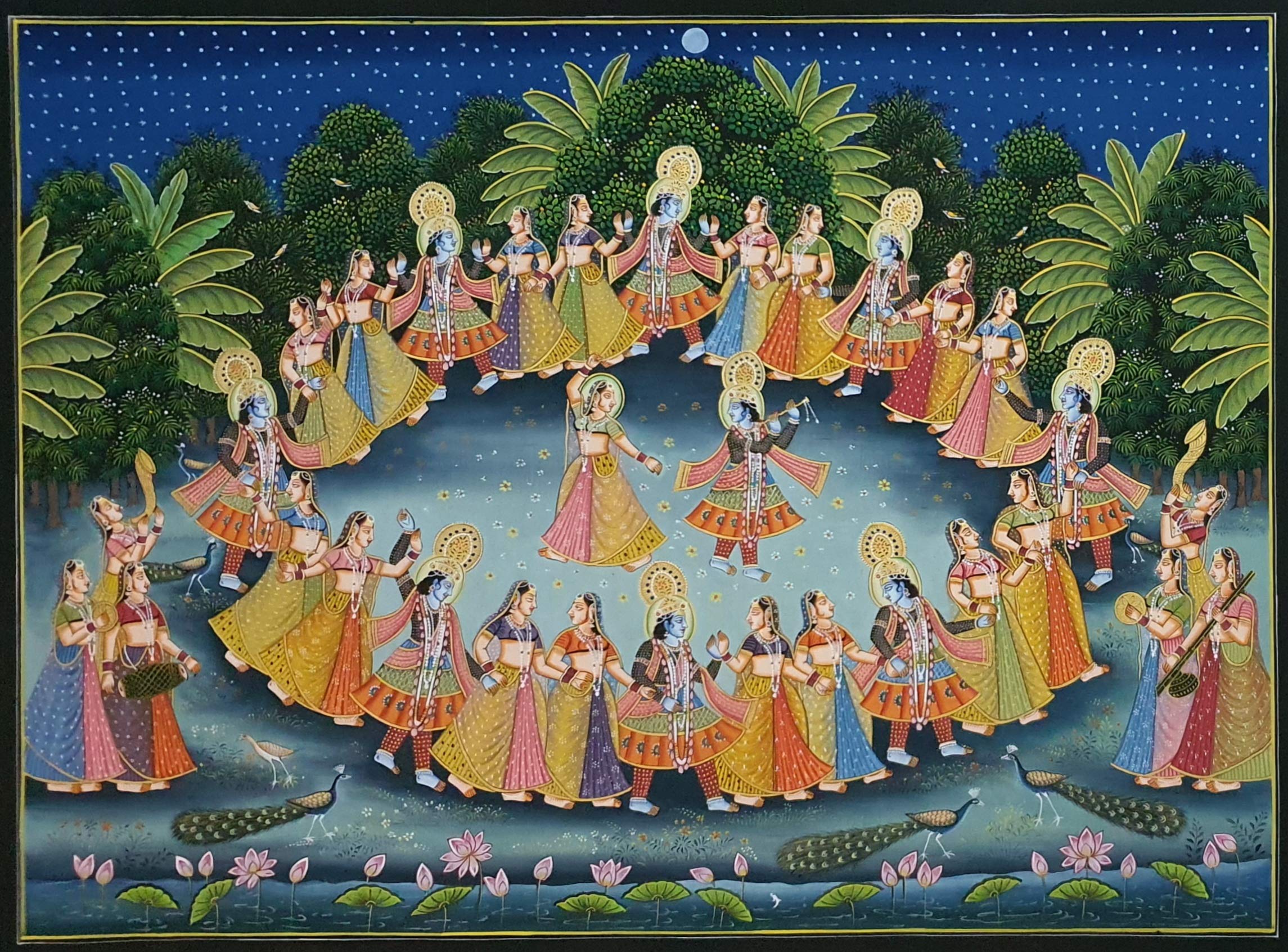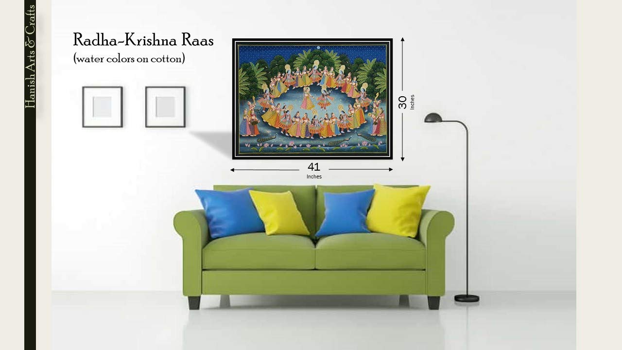 A beautiful painting involves the action or skill of using paint in the right manner; hence the end product will be a picture that can speak a thousand words they say. Arts have been in trend for quite some time now. Pichwai (pichvai) is a style of painting that originated over 400 years ago in the town of Nathdwara near Udaipur in Rajasthan India. Intricate and visually stunning pichwai paintings made on cloth depict tales from Lord Krishna's life. Pichwai (pichvai) is a style of painting that originated over 400 years ago in the town of Nathdwara near Udaipur in Rajasthan India. ... Lord Krishna is often depicted as Shrinathji in Pichwais which is the deity manifest as a seven-year-old child. You can gift this to a family or a friend. The painting has various forms of certain figures on it as seen in the image. You can add a good set of lights to the place where the painting is and the decor will give a different feel and look to the place. Quality and durability the painting has a matte finish.