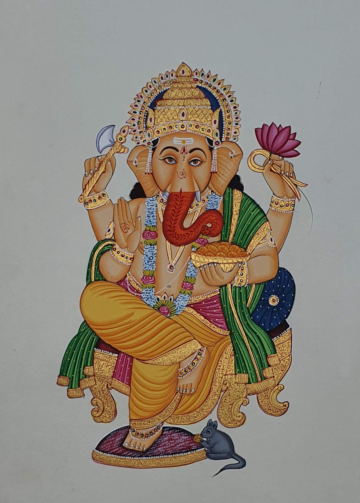 PICHWAI- PAINTED TEMPLE HANGING - Lord Ganesh Ji Painting (Handmade Painting 9x12 inches - Unframed) R012. Overview a beautiful painting involves the action or skill of using paint in the right manner; hence the end product will be a picture that can speak a thousand words they say. Early Life. Ganesha is the son of Shiva and Parvati and he is the brother of Karthikeya (or Subrahmanya) the god of war. ... Repentant Shiva ordered a new head to be found for the boy and as the first animal available was an elephant so Ganesha gained a new head and became the most distinctive of the Hindu gods. The painting has various forms of certain figures on it as seen in the image. You can add a good set of lights to the place where the painting is and the decor will give a different feel and look to the place. Quality and durability the painting has a matte finish.