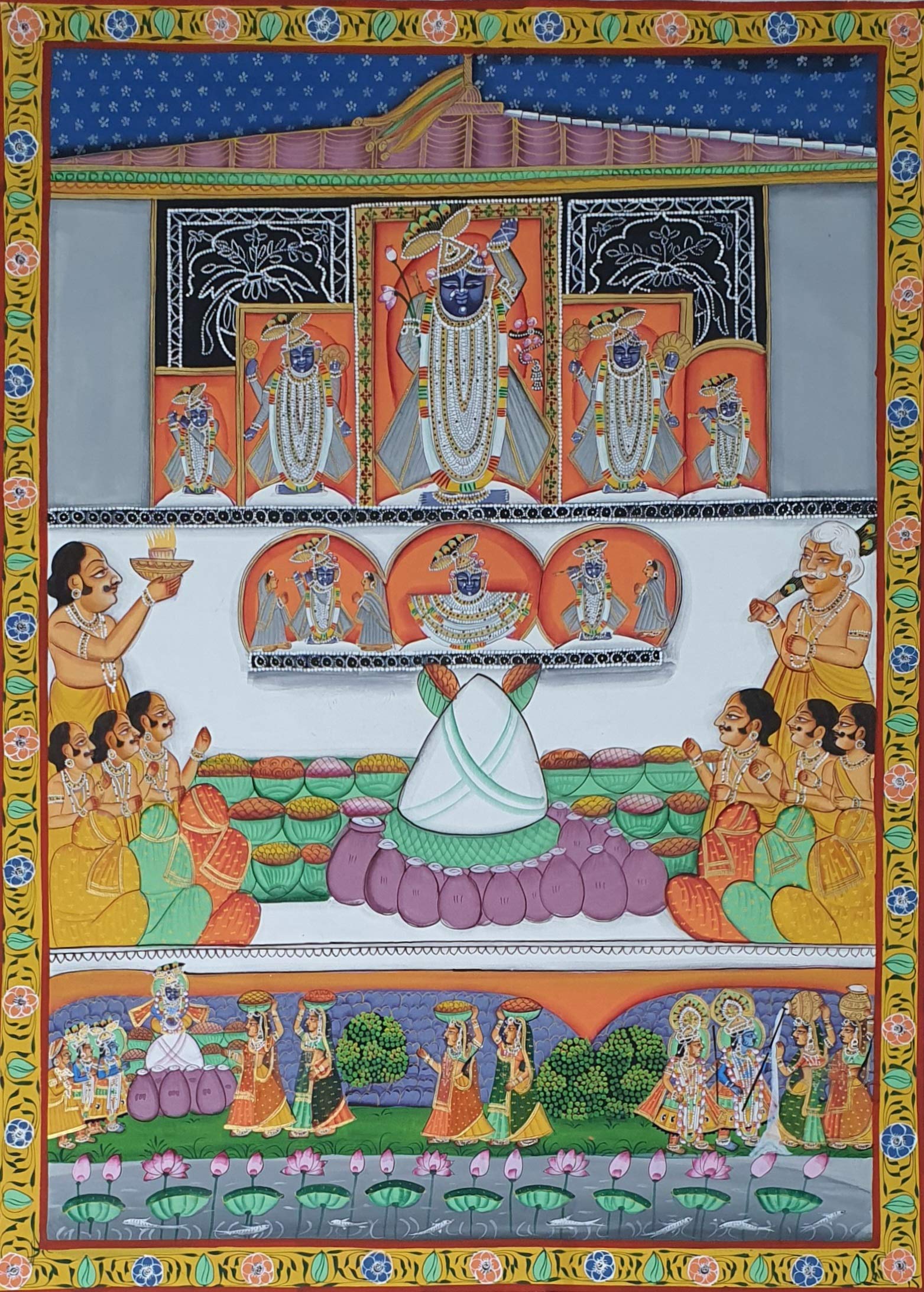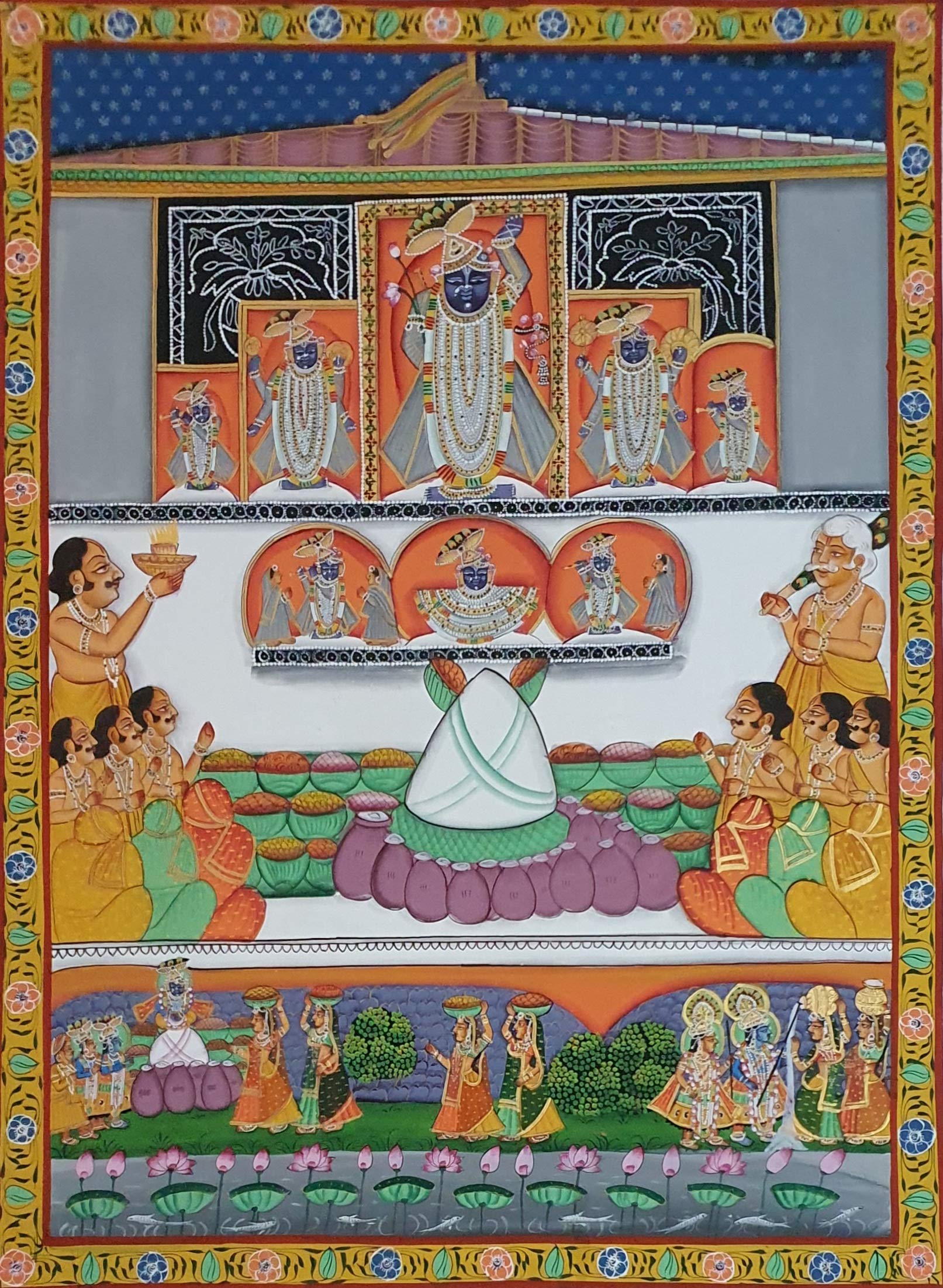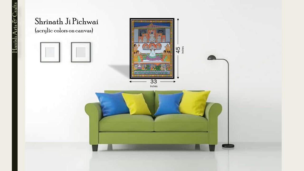 A beautiful painting involves the action or skill of using paint in the right manner; hence the end product will be a picture that can speak a thousand words they say. Arts have been in trend for quite some time now. Pichwai (pichvai) is a style of painting that originated over 400 years ago in the town of Nathdwara near Udaipur in Rajasthan India. Intricate and visually stunning pichwai paintings made on cloth depict tales from Lord Krishna's life. Pichwai (pichvai) is a style of painting that originated over 400 years ago in the town of Nathdwara near Udaipur in Rajasthan India. ... Lord Krishna is often depicted as Shrinathji in Pichwais which is the deity manifest as a seven-year-old child. You can gift this to a family or a friend. The painting has various forms of certain figures on it as seen in the image. You can add a good set of lights to the place where the painting is and the decor will give a different feel and look to the place. Quality and durability the painting has a matte finish.