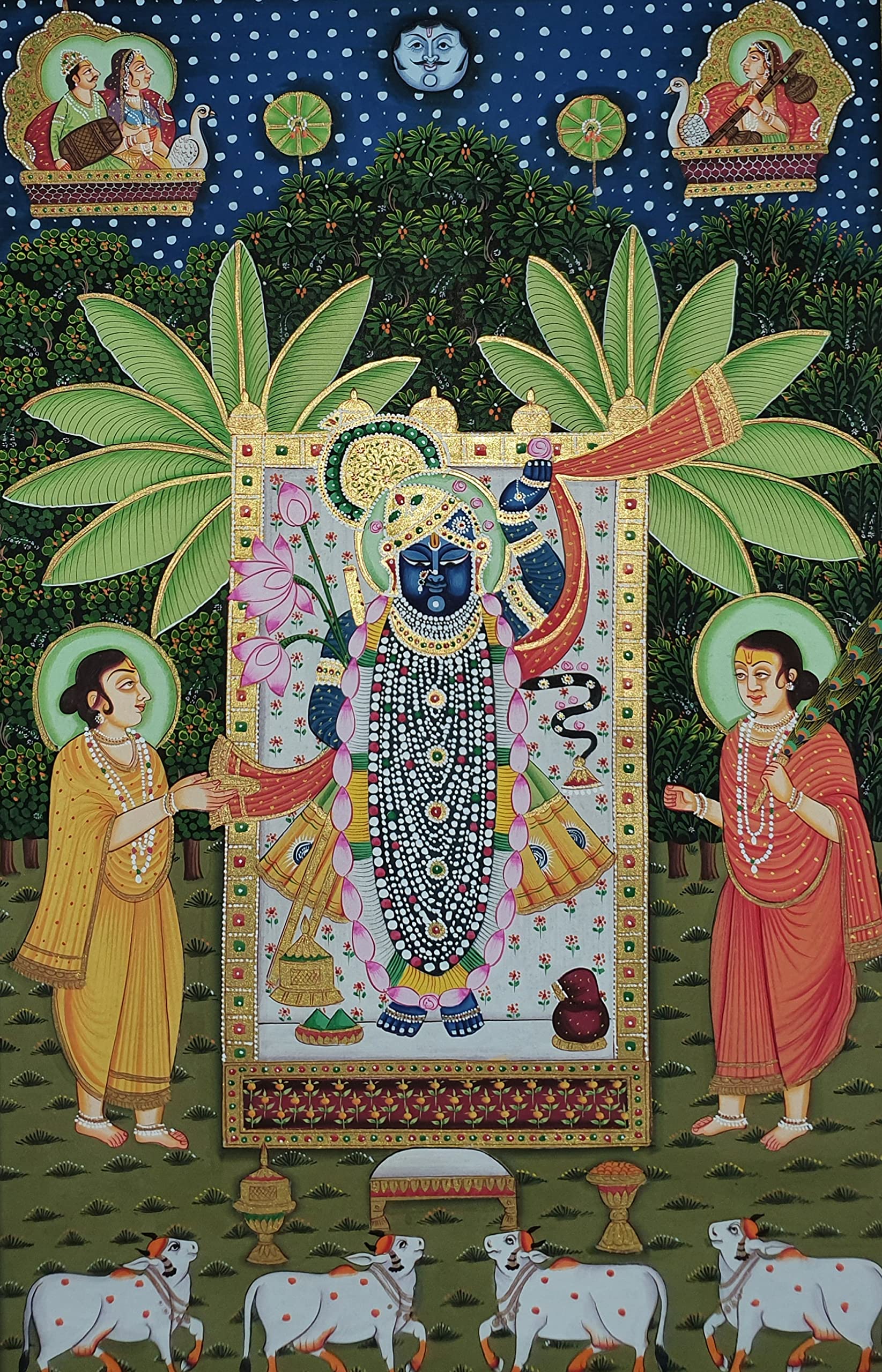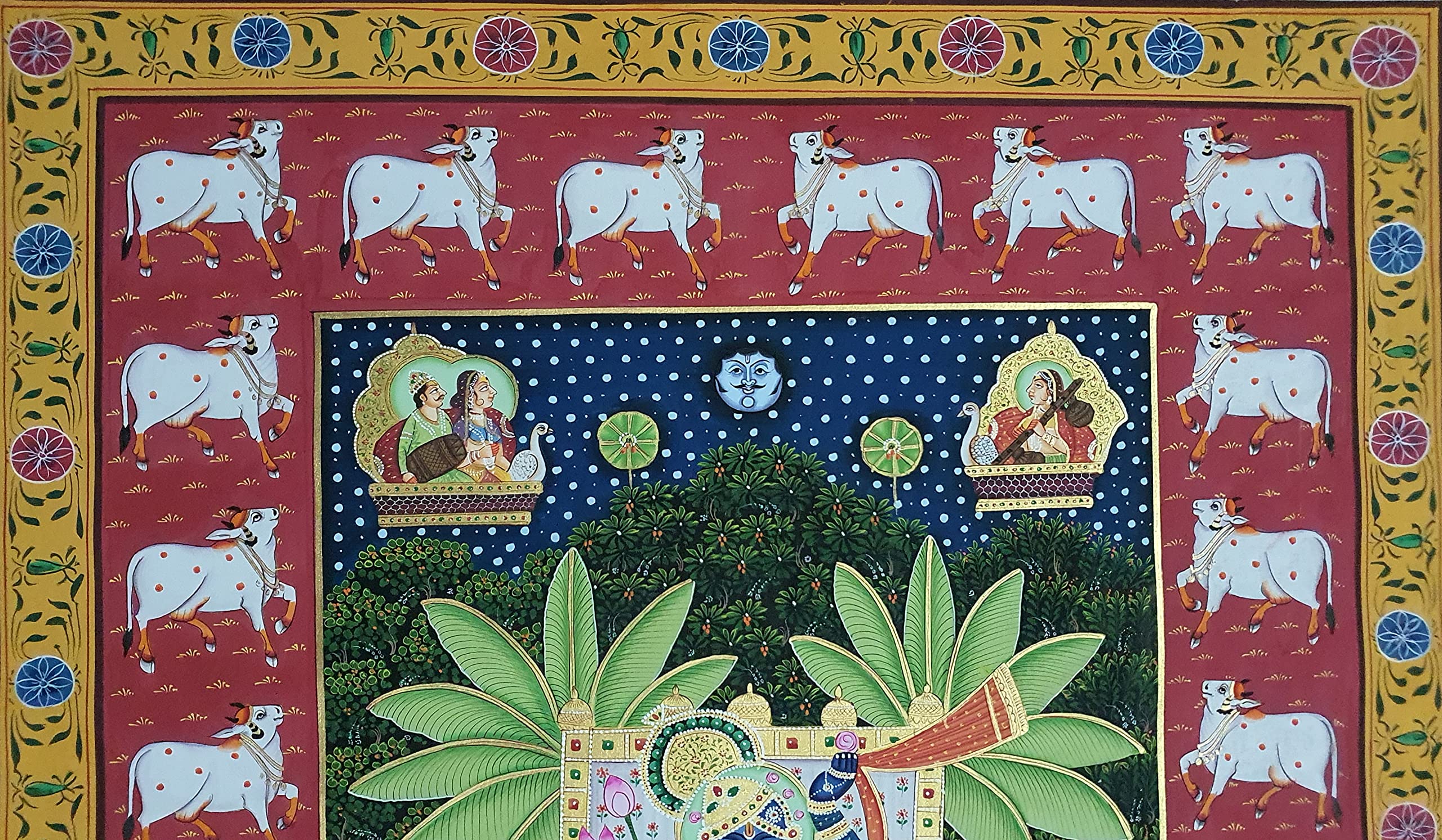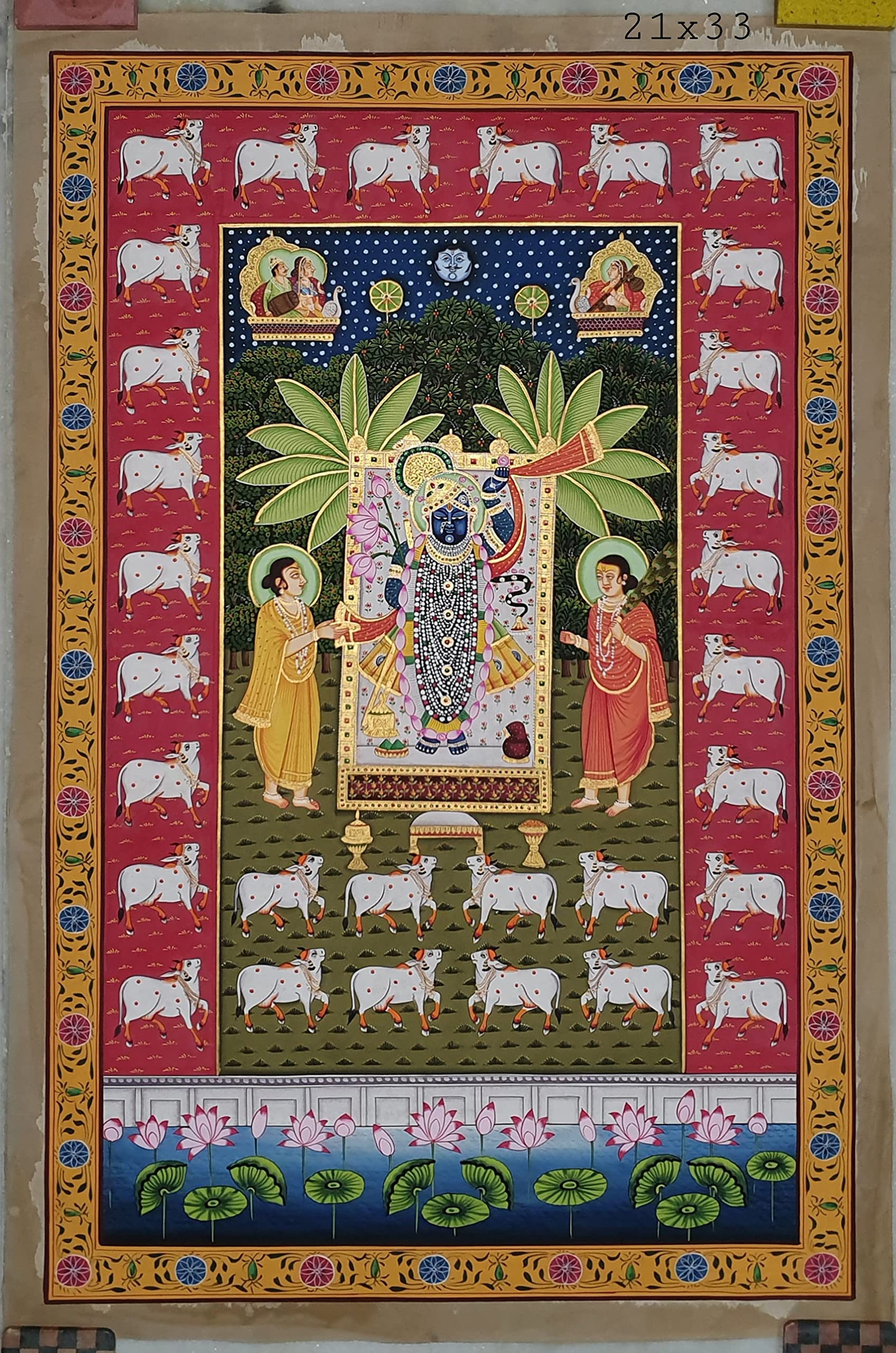 PICHWAI- PAINTED TEMPLE HANGING - Shreenath Ji Pichwai Painting - Hand Painted on Cloth (21x33 inches). overview a beautiful painting involves the action or skill of using paint in the right manner; hence the end product will be a picture that can speak a thousand words they say. Arts have been in trend for quite some time now. It can give different viewer different meanings style and design the saf wood matte abstract painting with frame is quite abstract and mysteriously beautiful. The painting has a nice frame to it. You can gift this to a family or a friend. The painting has various forms of certain figures on it as seen in the image. You can add a good set of lights to the place where the painting is and the decor will give a different feel and look to the place. Quality and durability the painting has a matte finish.