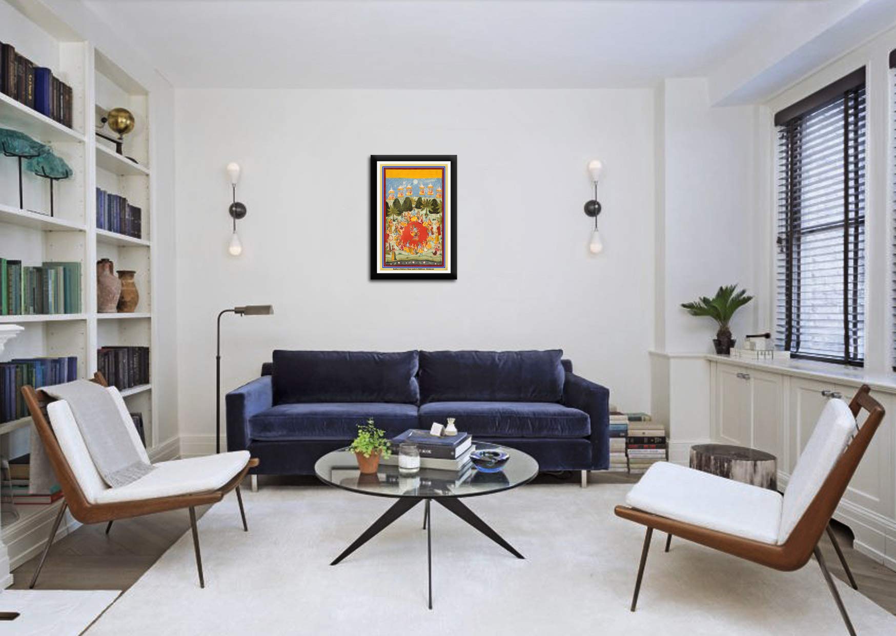 Pichwai is one of the most spectacular ancient & traditional forms of art which originated in the villages of Nathdwara in the state of Rajasthan India. This 400-year-old art form generally depicts and narrates the tales of Lord Krishna's life. The Sanskrit word "Pichh" means back and "wais" means hanging so Pichwais are paintings or hangings which form the backdrop behind the main deity of Krishna temples. The making of a traditional pichwai painting takes a considerable amount of time ranging from a couple of weeks to months.