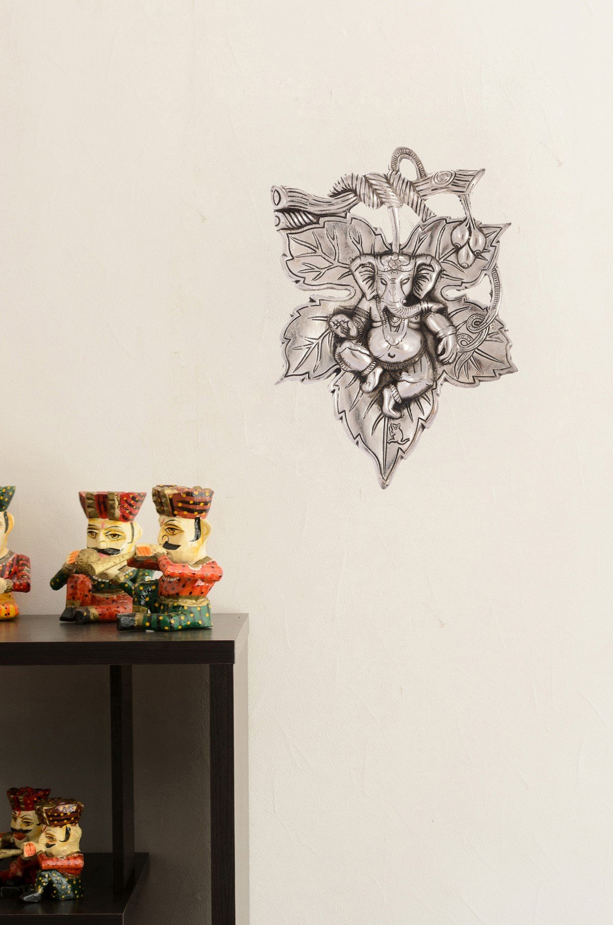 JAIPUR STONE WORK Lord Ganesha on Creative Leaf Metal Wall Hanging (20 cm x 1 cm x 29 cm Silver)