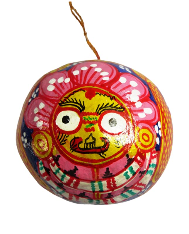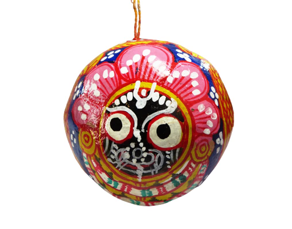 WOOD CARVING WORK COMBO DOOR HANGING: PURI JAGANNATH and PIPILI APPLIQUE TORANA: i) Clay Hand-painted Ball-shaped Hanging Emblem of Puri Lord Jagannath Balabdra and Subhadra; ii) Pipili fabric hand-stitched Wall-hanging: for all kinds of Doors and Walls (JBS Ball: 4.5 Inches in Diameter; 240 Grams; Pipili Torana: Length: 3 Feet X Height: 9.5 Inch X 55 Grams) Set: 300 grams. Ideal for home temple office doors and walls