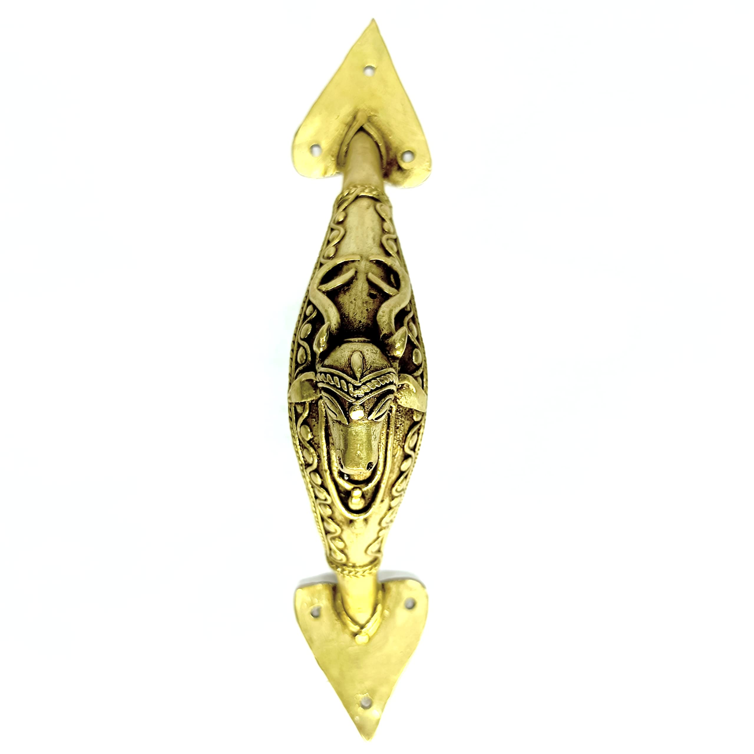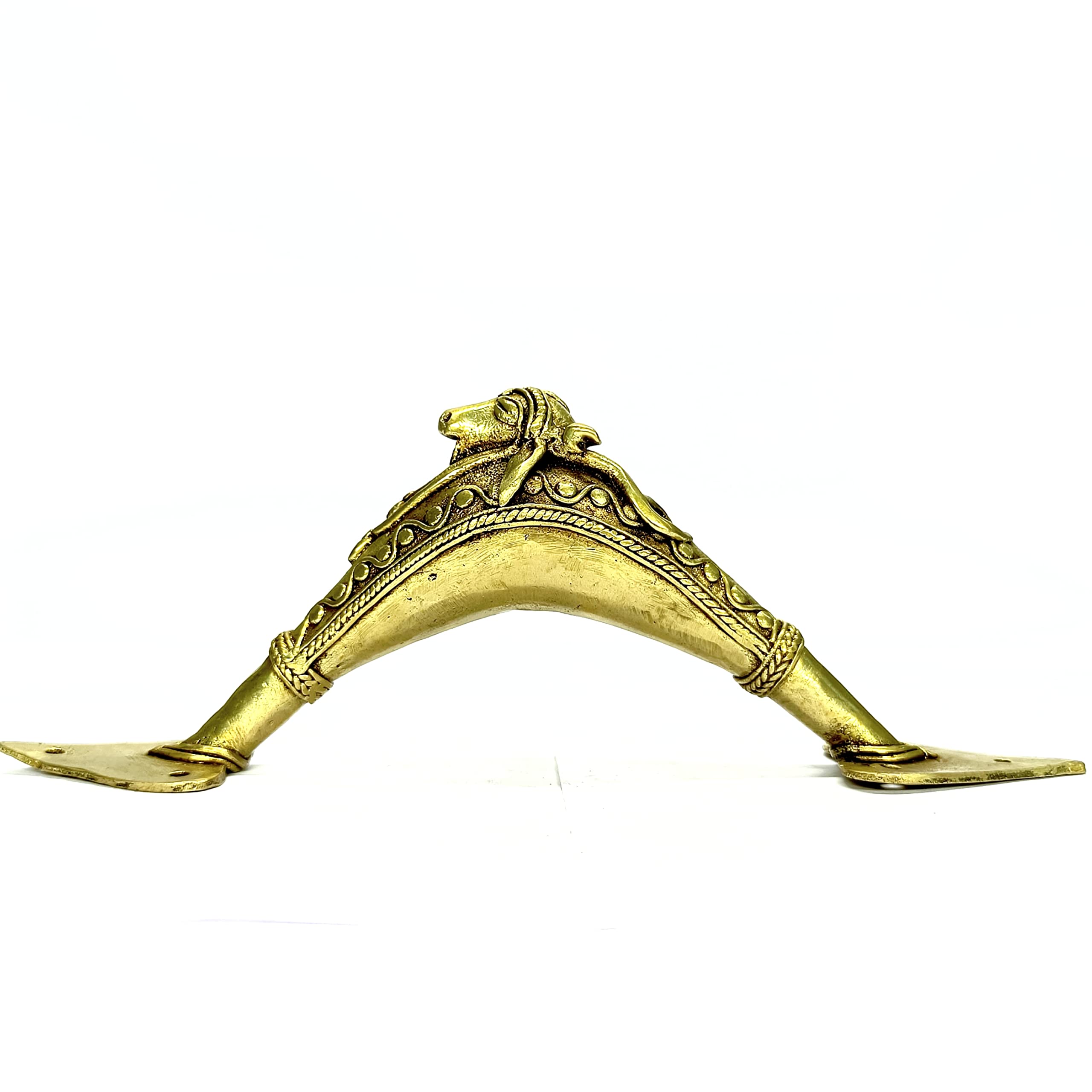DHOKRA CRAFT brings you this decorative Nandi design door handle made of good quality brass. Handmade in Dhokra art this door handle enhances the decor value of your house office or temple and will add a spot of lustre to the ambience. Strong durable and comfortable to hold can be attached easily with two screws given on both sides and can be used for doors cupboards cabinets etc. Crafted by the tribal artisans of Chhattisgarh ( Dhokra art of Chhattisgarh ). Dhokra craft is a casting technique using age-old wax casting. Hence the product might have some dull/black patches which is a symbol of handcrafted Dhokra art. Please note: Due to various types of lighting and flash used while photoshoots the colour shade of the product may vary.