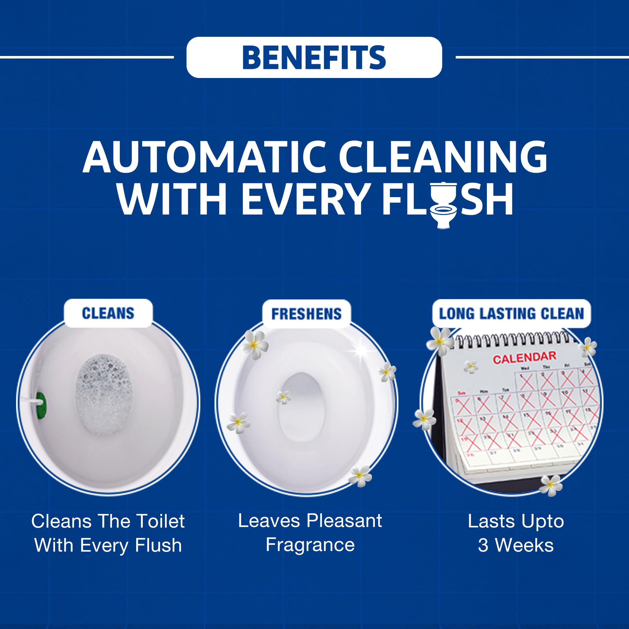 Now a product that will clean shine perfume and even disinfect your toilet! Harpic hygienic toilet rim block is an innovative cage-free toilet block that helps clean and freshen with every flush. The toilet rim block works to maintain a constantly fresh and hygienic toilet. So your toilet feels fresher for longer even in between cleans. Maintaining the freshness and cleanliness of your toilet with harpic hygienic toilet cleaner is so easy - just unpack pull the plastic clip to loosen. Then using the clip securely attach the block to the rim of the toilet. And you are good to go! A single block of harpic hygienic toilet cleaner lasts upto 3 weeks depending upon your usage. It can help prevent lime scale build-up keeping your toilet clean for longer. For regular cleaning use harpic liquid. Harpic hygienic toilet rim block targets the toilet bowl for stains and deposits and keeps it visibly clean and fresh for longer. The set of fragrances available include citrus lavender and jasmine that keep away odour and give a pleasant fragrance with every flush. It fits discreetly under the rim and prevents lime scale deposits and even germs. India's #1 Toilet Cleaner*. Caution: use only for toilet bowls. Keep the block out of the reach of children. Avoid contact with eyes and skin. In case of accidental contact with eyes or skin wash immediately with plenty of water. If irritation develops and persists seek medical advice. Do not swallow. If swallowed seek medical advice immediately and show this container or label. *Reckitt Benckiser calculation based on data reported by NielsenIQ through its Retail Index Service for the Cleaners - Toilet Category value for the 12-month ending June 30 2022 for the India (U+R) market. (Copyright © 2022 NielsenIQ).