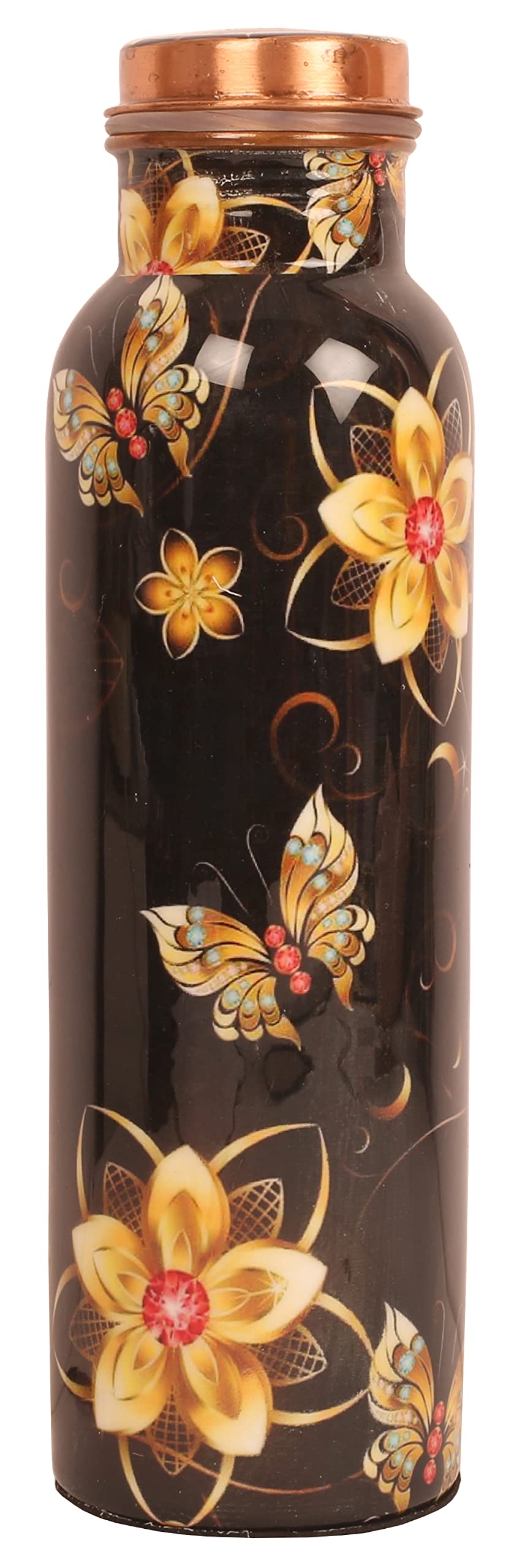 INDTRESOR Pure Copper Water Bottle - Handcrafted - Ayurveda health benefits - Large 1000 ml - Leak proof - Easy to carry for Sports Fitness Yoga School - Black Base Floral Textured Colorful Enamel