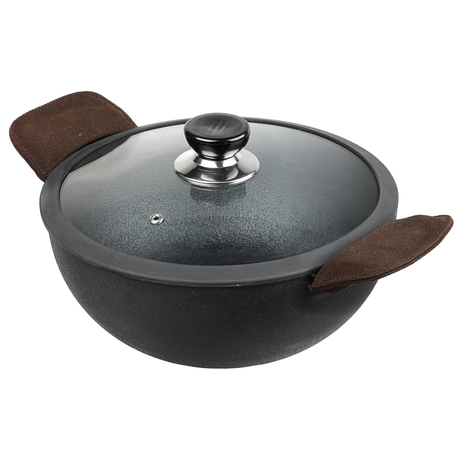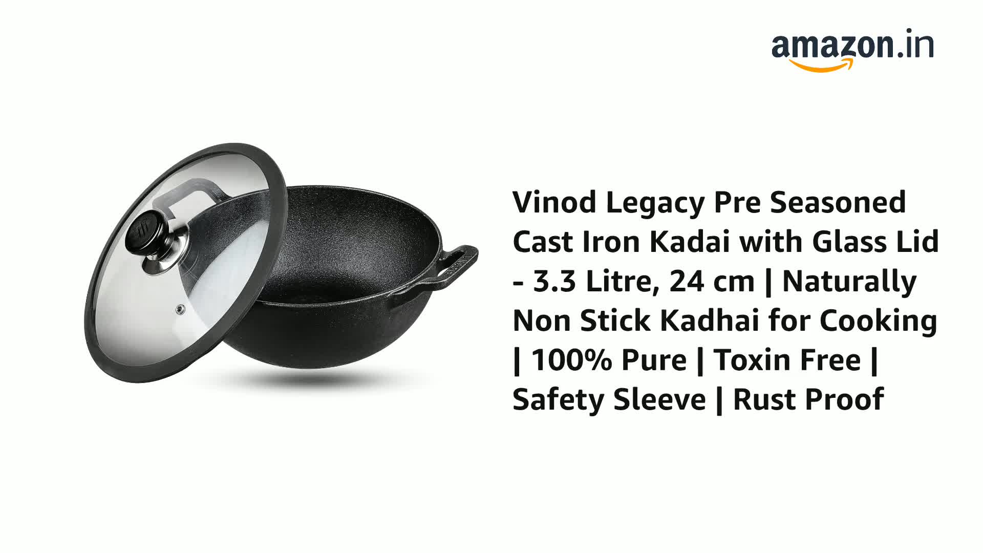 Vinod Legacy Pre-Seasoned Cast Iron Kadai with Glass Lid 24 cm Diameter (3.3 Litres Capacity) Non Toxic Enamel Free - Black Gas Stove and Induction Friendly