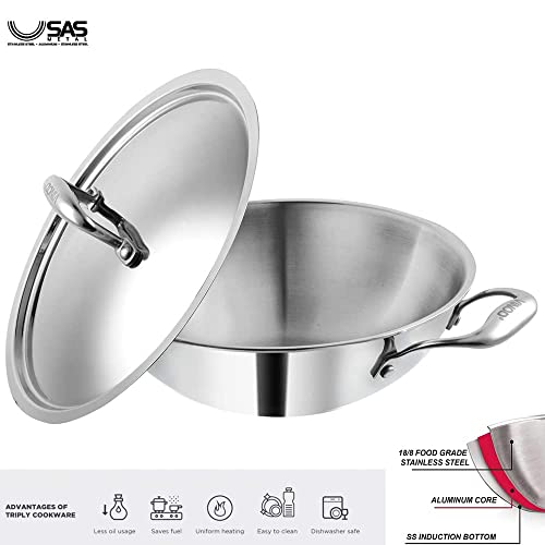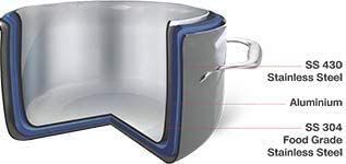 One of the first in India Platinum with Triple-layered construction superior food-grade 18/8 stainless and SS 430 magnetic stainless steel supports Induction cooking. With an aluminum encapsulated in bottom and wall it ensures faster cooking minimizes sticking with even heat distribution. With its classically styled and polished stainless steel exterior and a matte finished interior it not only is good to cook in but also serves. The latest in Platinum brings a fine balance of good looks and functionality it plays the dual role of being suited to both Home and Industrial Chefs.