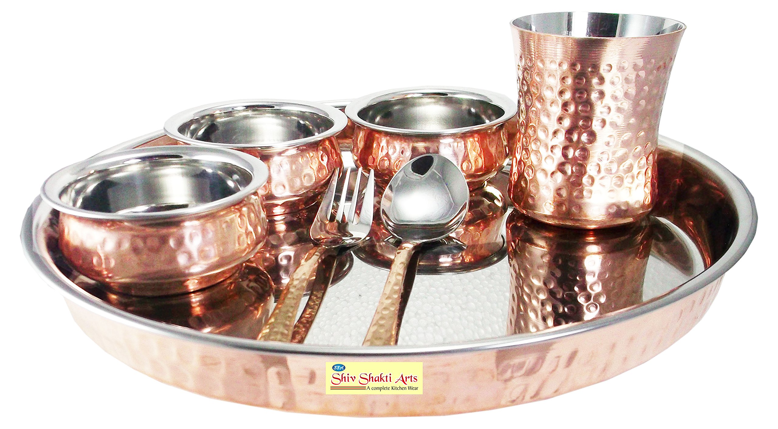 SHIV SHAKTI ARTS Stainless Steel & Copper Traditional Kitchen Dinner Set of 7 Pieces 1 Plate Thali 3 Handi Bowls 1 Glass 1 Fork 1 Spoon