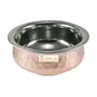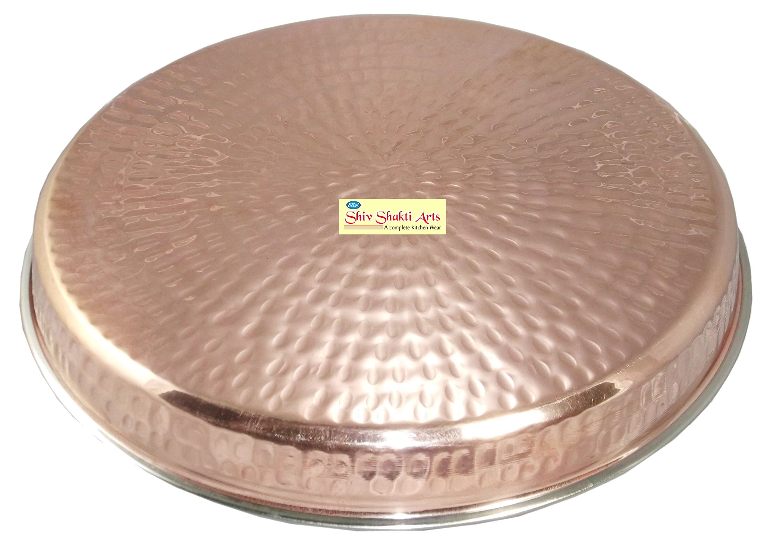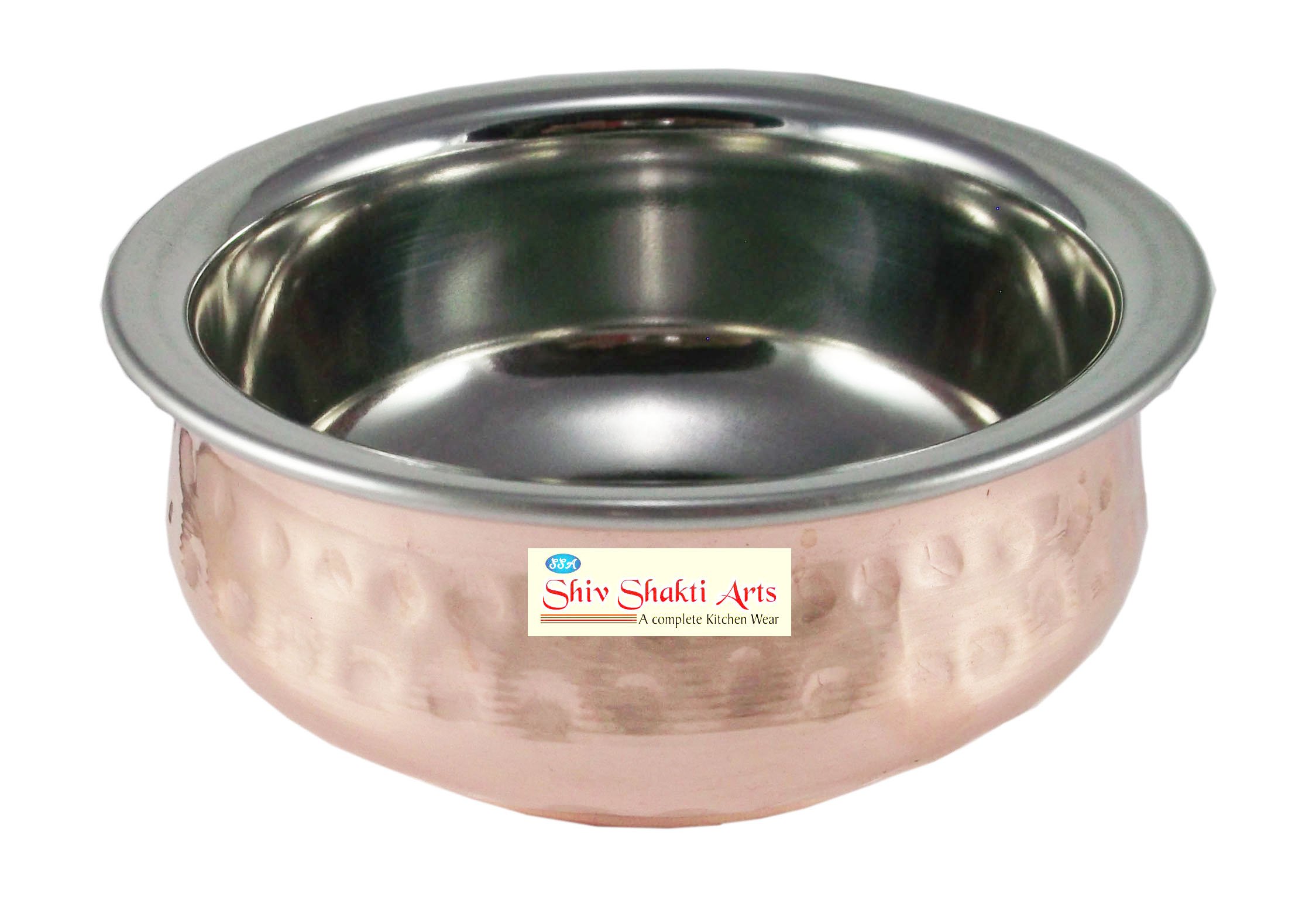 Relish Indian cuisine in Indian style! This is a set of centerpiece serve-ware for Indian food. Serve Indian dishes to your friends and family in this unique and ethnic looking centerpiece serve ware. With this serving utensil set your Indian style dining experience goes several notches up. The material used is food grade. Hammered Copper is used only on the outside of the utensil and does not come in contact with the food. Only the high quality food grade stainless steel is in contact with the food. Two layers of metal with air cushion ensure that the food stays warm much longer. Serving dinner in this dinnerware handi would be unforgettable experience. Care Tips a) Clean your copperware by hand and avoid dishwasher as the detergent can cause oxidation leading to permanent damage. b) Use a solution of equal quantities vinegar or lemon juice and salt diluted with some water at such times but don't use it regularly. c) Avoid scratchy cleaners like steel wool. d) A simple soft cleaning liquid on soap base hot water and a soft washing cloth is best for daily use. e) Use Copper Shining Powder for cleaning the copper utensils. Completely safe and gentle on hands. f) Copper Utensils Tarnish from time to time. This is Normal for an Authentic Copper utensils. ; Many Customers Love the Vintage/Antique Tarnished Look but Care Instructions for Minimizing and Removing Tarnish are Provided with Order