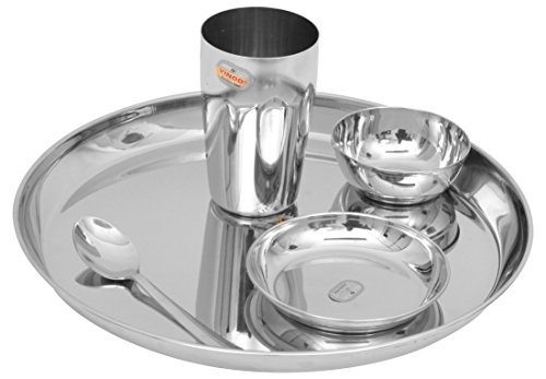 Vinod presents this silver color dinner set. It is made of stainless steel. This package contains 1 plate 1 bowl 1 small plate 1 glass and 1 spoon. It has seller warranty up to 10 years and the replacement warranty is available against manufacturing defects only.