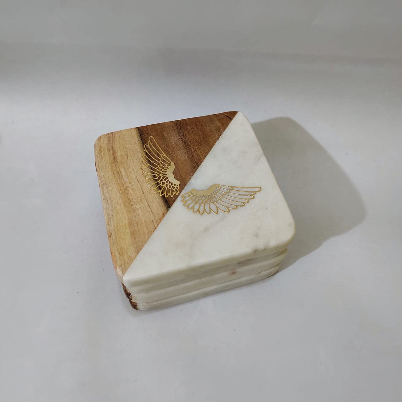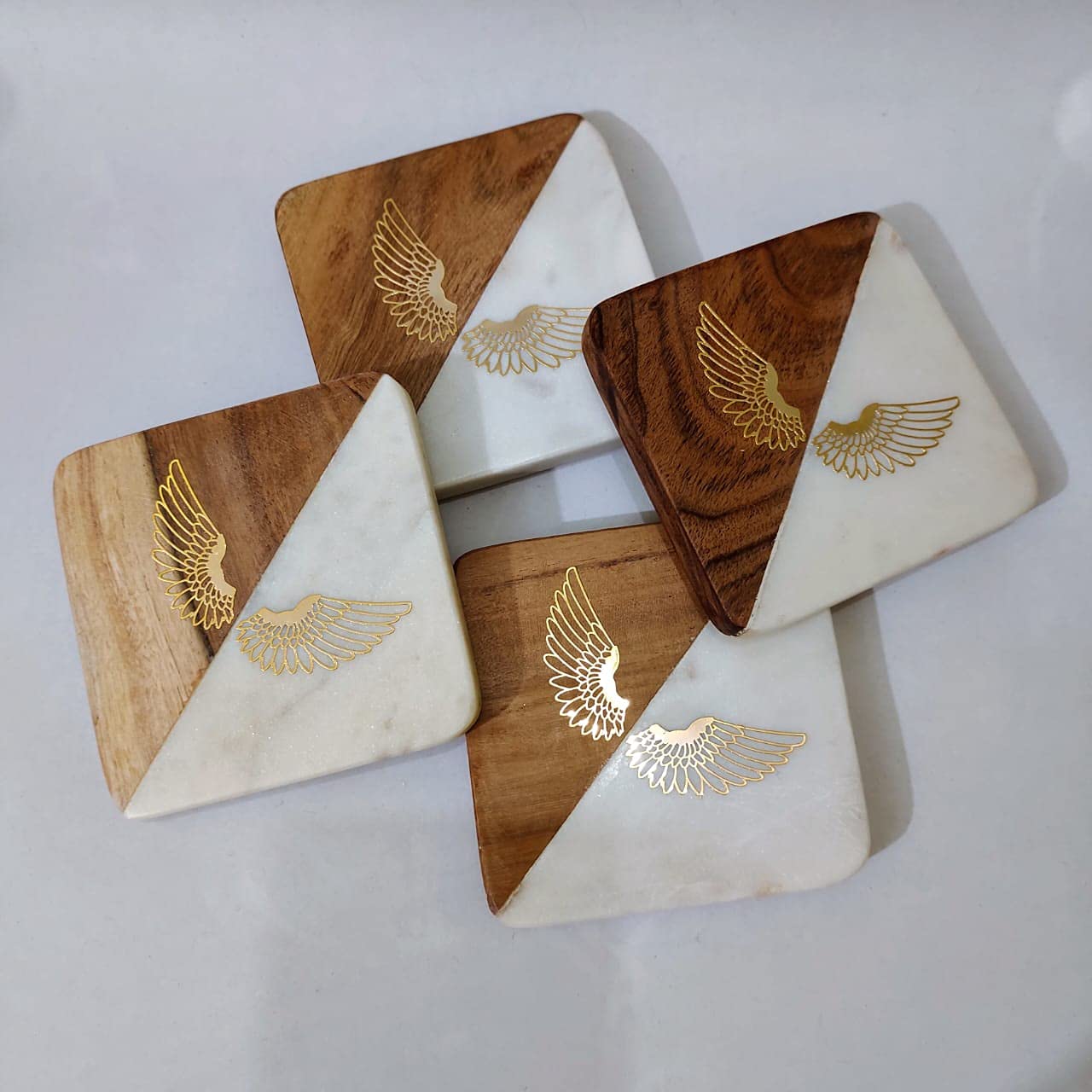 MARBLE INLAY ART AGRA - PACCHIKARI This Beautifully White Marble & Wood Sqr Wings Brass Metal Sticker Design Coasters (Set of 4) for Cups Mugs Glasses (White with Wings)
