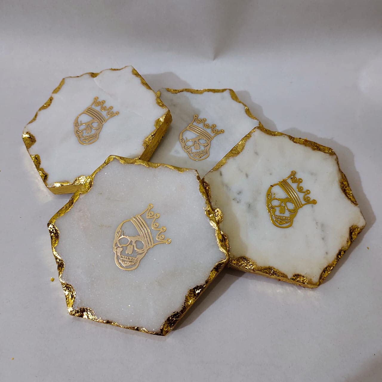 Vl International " MARBLE INLAY ART AGRA - PACCHIKARI" his beautifully designed & handcrafted Marble coaster set of 4 pcs is stylish for A Perfect Gift for all occasions be it housewarming birthdays Mother's Day Anniversary Diwali etc. Please keep it covered when not in use. Do not wash just wipe the surface with moist cloth to clean. As this piece has been hand crafted and is made of natural stone there will be variation in color and the marble pattern. The edges have been gold foiled for an aesthetic appeal. The marble has been mounted on a sturdy brass stand.