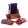 This Mobile Pen Visting card and Desk organizer not only helps you keep your desk uncluttered by accommodating all the essential office supplies but also offers organization within itself for the ease of locating small items like stapler pins binder clips erasers and such. Beautifully crafted with Sheesham wood and brass this accessory adds space to a desk .The multi-level compartments provide an organized placement of various items. And coasters for Beer cans/Water glass/ Tea Coffee cups and etc