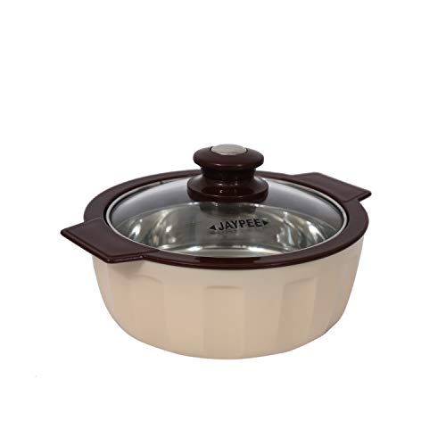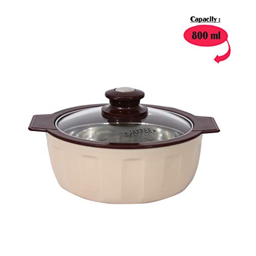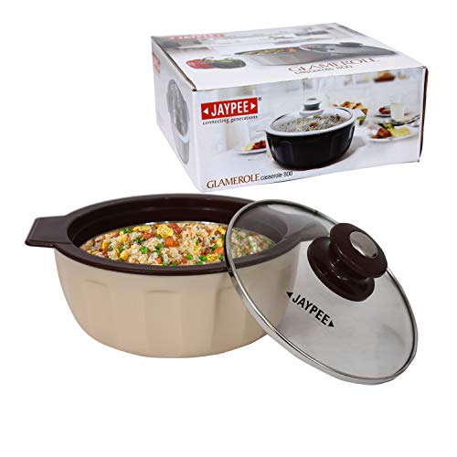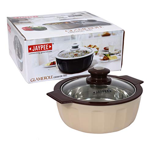 Jaypee Glamerole casserole is crafted out of best materials with elegant plated top with knob and a transparent glass lid. Now you can cook & display with pride the appetising food with your fine finish garnish and flourish with special toppings. A safety hole in the glass lid not only makes it antilock it also lets out the aroma. The inner container is made out of stainless steel. The plastic outer body is of virgin plastic with beautiful graphic exteriors which is inspired by creamic surfaces. Material Used: Top-PP Ring-ABS(chrome plated) Base-PP Container-Stainless steel and insulation is of polyurethane material. Food grade BPA Free.