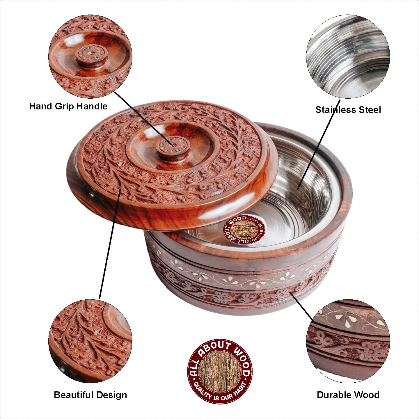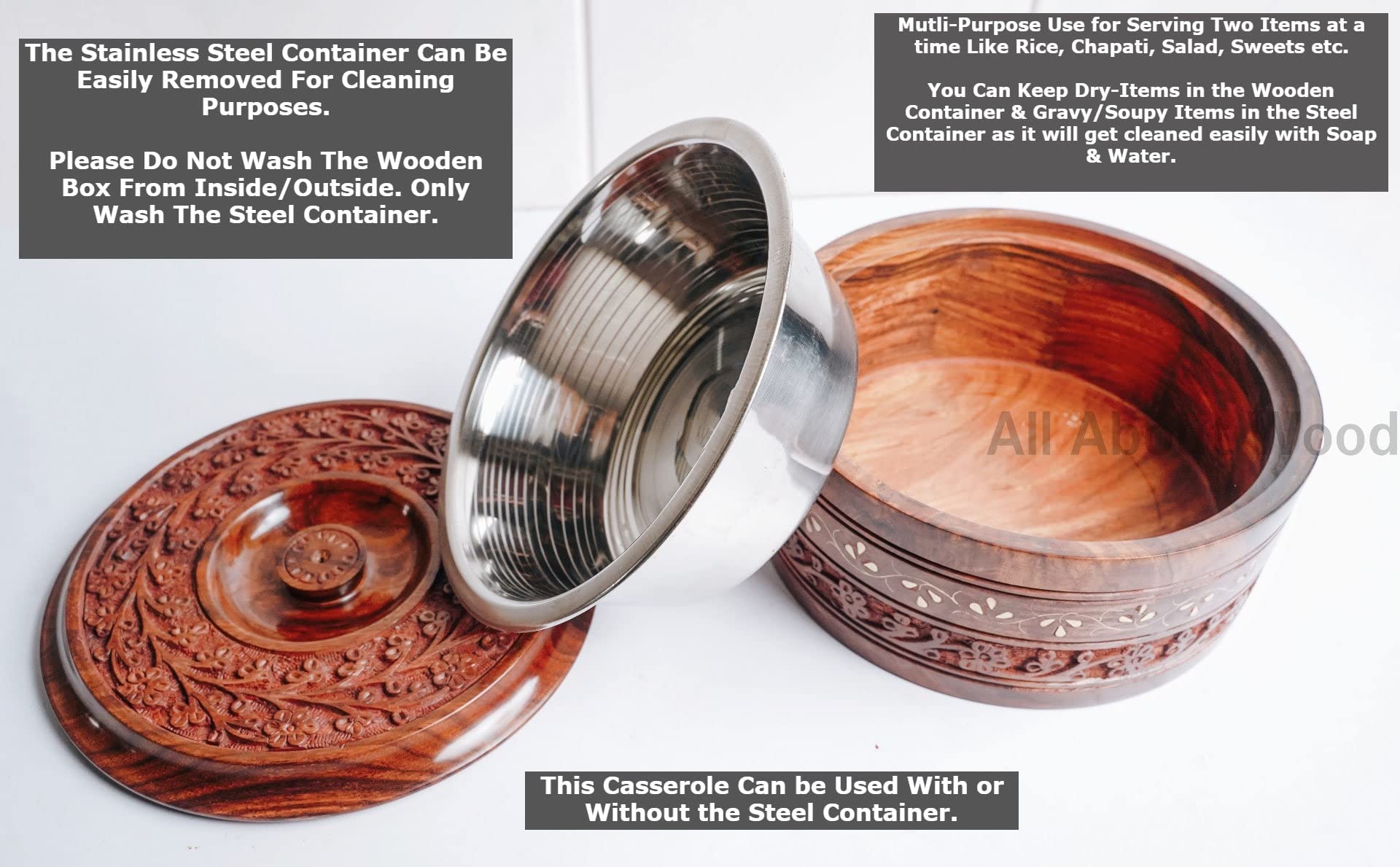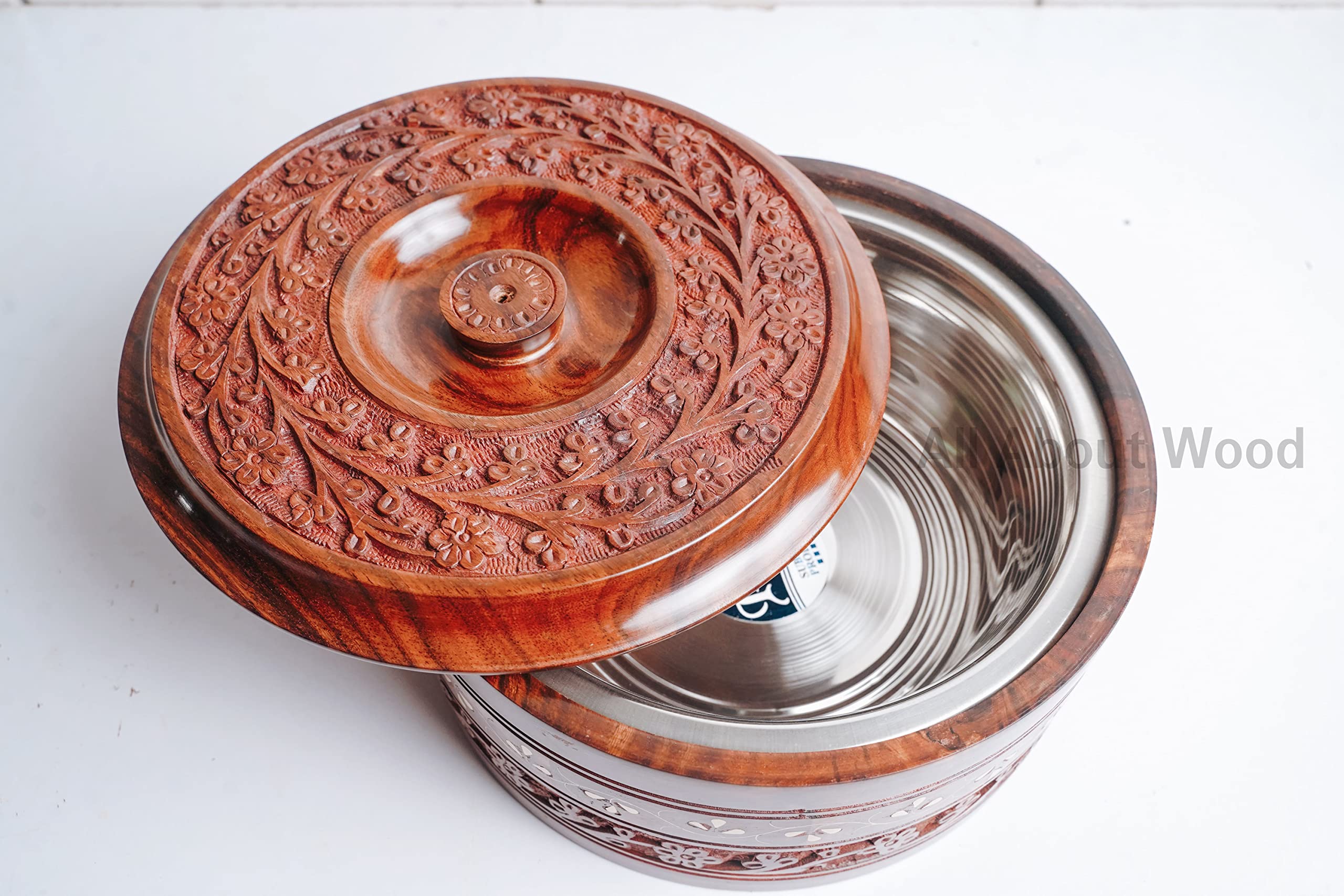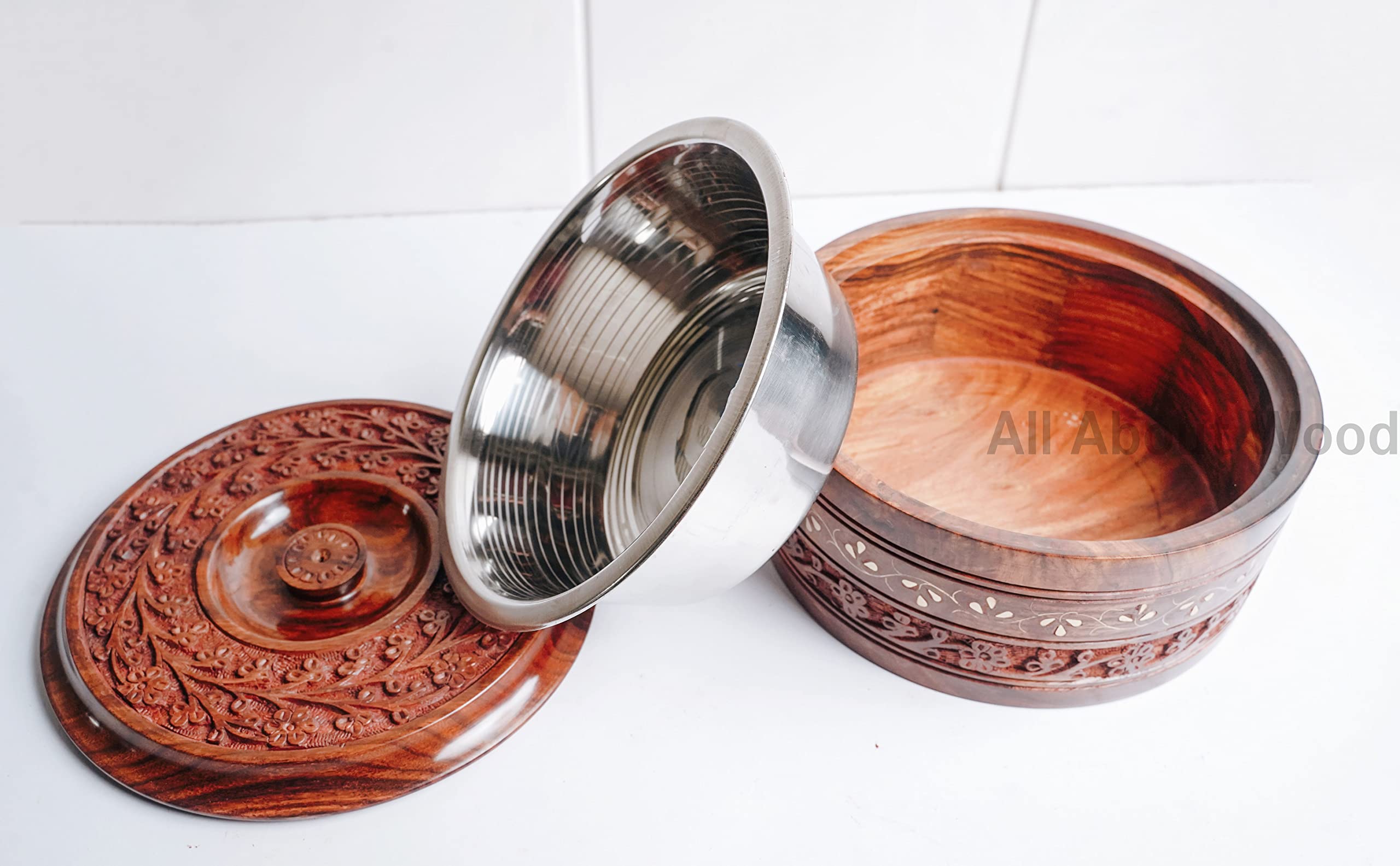 Beautifully handcrafted wooden chapati box/casserole made from high quality Sheesham wood and inner stainless steel container