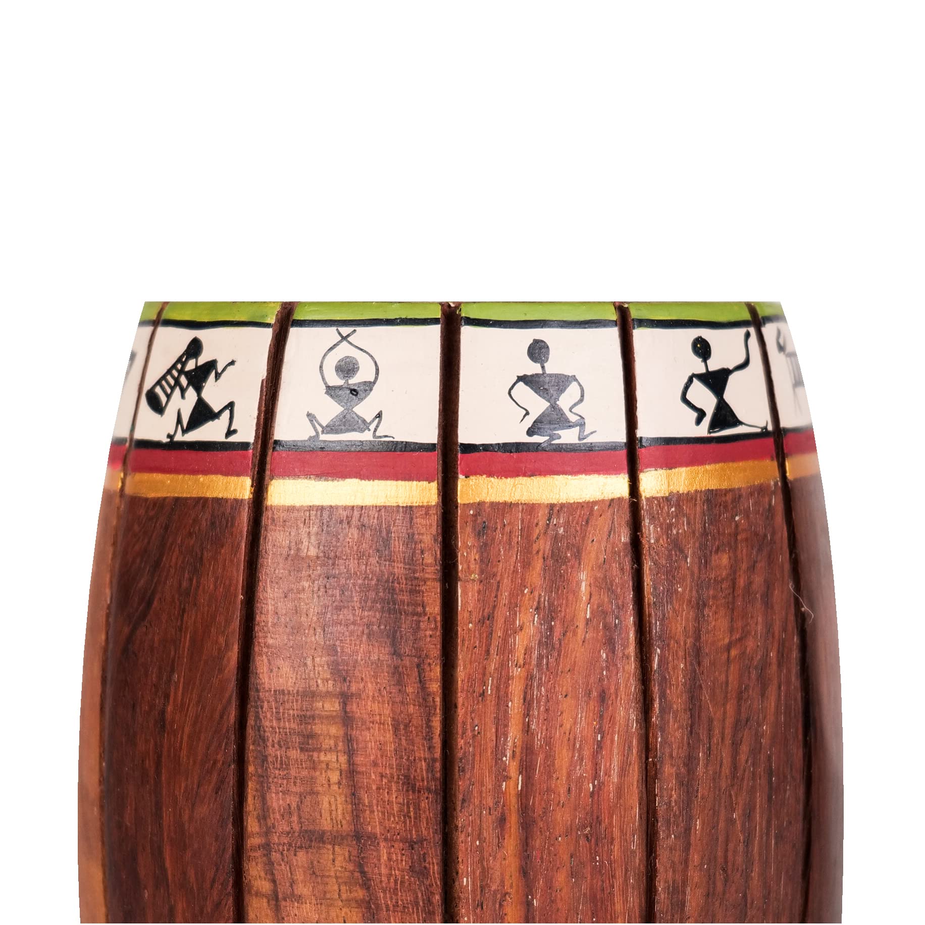 KHURJA POTTERY 'Warli Barrel' Wooden Cutlery Holder for Kitchen | Handpainted Spoon and Fork Stand cum Pen Stand for Study Table (4.7 x 3.8 Inch Brown)
