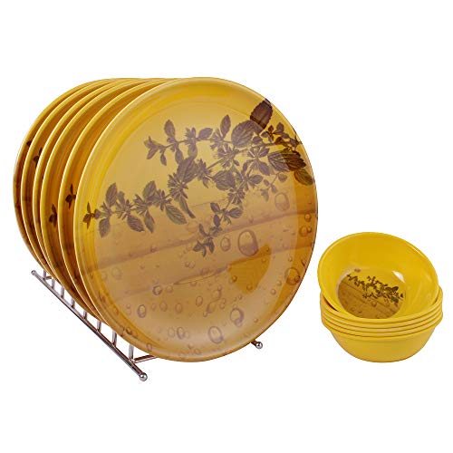 Get the posh and sophisticated feel of a rich dining experience in an expensive hotel right in the comfort of your home with this set of yellow coloured dinner plates from golden fish. Made of plastic this round set of plates is lightweight & durable. Additional benefits: this dinner plate is microwave-friendly that makes it easier for you to heat the contents rather than transferring them to another utensil. It is also dishwasher-safe making it easy for you to clean it without exhausting yourself pack of 6 plates & 6 bowl . This dinner plate includes six dinner plates and enough to set a beautiful dining table. Break resistant dishwasher safe; microwave safe stackable; hygienic; design and color will never faint made from toughened extra-strong and scratch resistant material colour: yellow base with floral patterns