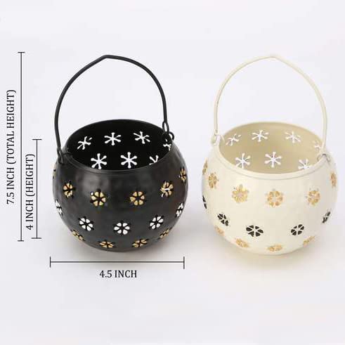 PRODUCT DESCRIPTION:Brighten & beautify your home & office right now by using this pair of hanging tealight holders made in durable rust-free metal in a spherical shape. It is available in black & white shades and showcases hand-etched floral patterns on the bodies. Imitating a lantern you can put a tealight candle inside each holder to spread a soft subtle light along with beautiful patterns on the walls. Gift this set to your loved ones on special occasions & festivals or use it to create memorable moments at home.FEATURES:Handcrafted in strong & rust-free metal this tealight holder pair is one of its own.With the ability to emit a soft light across the room through its beautifully hand-etched floral surface these hanging holders come in a spherical shape in white & black hues respectively.Both the holders come with an attached metallic hanger and space inside to put a tealight candle.The light diffused from them throws beautiful patterns on the surrounding walls.Hang this combination from the ceiling of your favourite room at home or office.It makes for a fabulous & perfect gift for festivals such as Diwali Christmas anniversary & housewarming parties or birthdays.NOTE:Please refer to the dimensions in the image.The color shape and design may vary slightly from the image as the product is completely handmade by Indian artisans which makes it unique.It is not an electric ceiling lamp.CARE INSTRUCTIONS: Use only a soft dry or a mildly wet cloth to wipe any dirt.