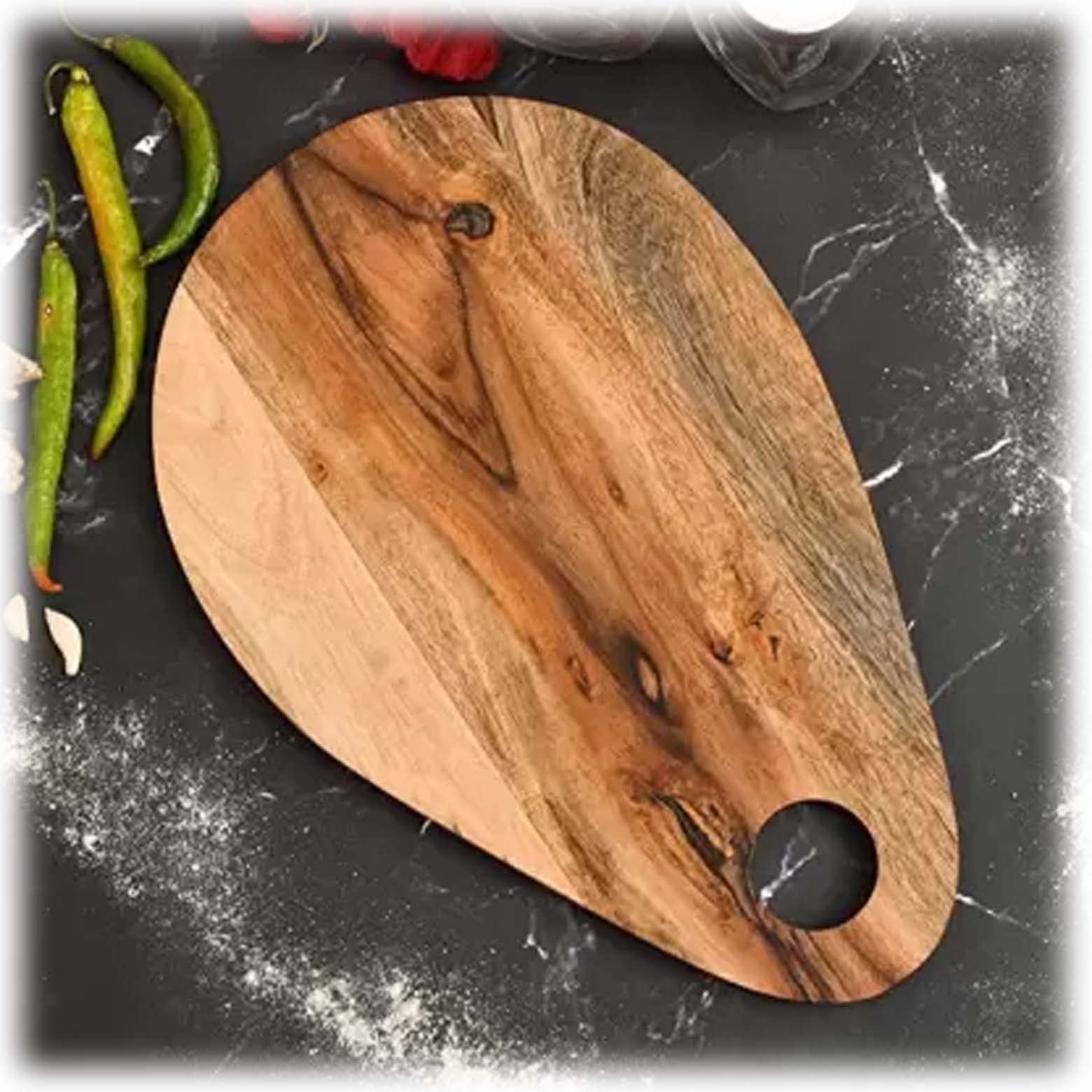 wooden chopping board best suited for cutting fruits and vegetables. Also be used for serving purpose. Sturdy handle with wider base gives a secure grip and helps reduces slips. Can be used to transfer uncooked pizza dough cooked pizza and homemade breads pastries in and out of the oven pan or outdoor charcoal grill with ease. High quality wooden Chopping board which is purely Natural very handy and hygienic way of cutting. Nontoxic food grade material is used and anti-skid mechanism also durable and easy to clean. Ensures perfect cut enhances the durability of knife. Can be used for cutting all types of fruits and vegetarian / Non-vegetarian food easily. So from now use this Chopping Board for your Kitchen and be safe. It has a small hole in the middle which can be used for hanging the board for drying etc. It contains a leather strip which can be used for hang the board Exquisitely designed our chopping bards can also be used as serving trays for cheese bread or fruits. The actual image might vary due to natural variations of wood. Washing Instructions: Wipe with a clean cloth with mild detergent and air dry. Do not scrub.