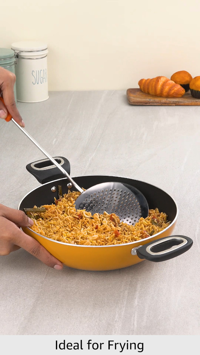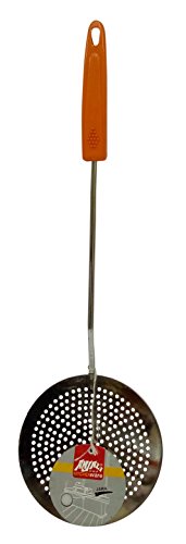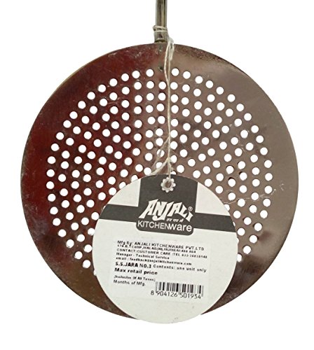 Crafted with great attention to detail the anjali stainless steel jara - js03 is sure to make a useful addition to your kitchenware. The jara has a thin long metal handle that is fixed on a sturdy black plastic holder that offers a superior and secure grip during frying. The food grade metal is resistant to rusting and ensures long lasting usage. The small perforations on the jara quickly drain out excess oil while the long handle prevents oil spilling during frying.