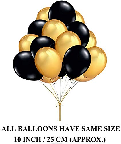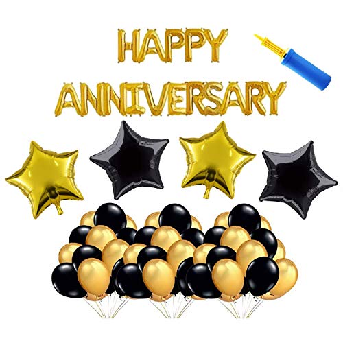 Package included: 50 Pic Metallic Balloons (25 Pic Golden + 25 Pic Black) + 4 ps Star Foil balloons (2 Golden + 2 Black) + 1pc (Happy Anniversary foil balloons) + 1 Free Air Pump