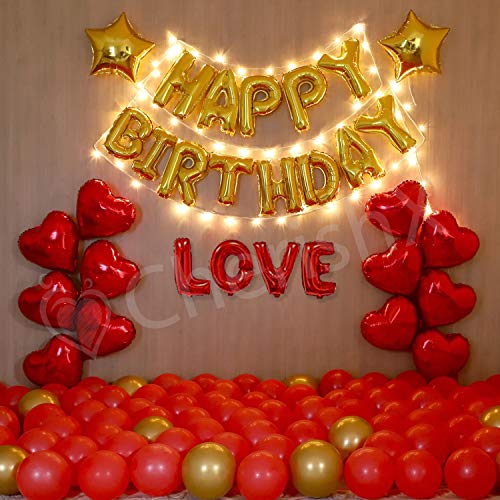 • ROMANTIC BrthDAY DECORATION KIT - This is a complete decorations kit which includes 1pc 16" inches "HAPPY BrthDAY" foil letter balloons (golden color) 50pcs 10 inches red latex balloons 12 pcs Red hert shape foil balloons 10pcs golden metallic balloons 2
