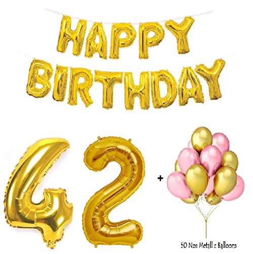 Number 42 Gold Foil Balloon and 50 Nos Pink and Gold Color Latex Balloon and Happy Brthday Gold Foil Balloon Combo