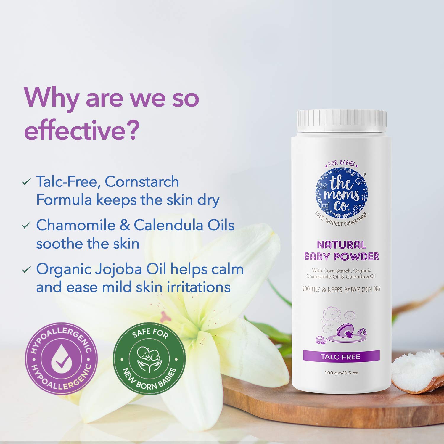 The Moms Co. Tear-Free Natural Baby Wash with Calendula Avocado Oils and USDA-Certified Organic Oils Like Argan Chamomile (200 ml)Our Natural Baby Wash is a toxin-free combination of Coconut based mild cleansers that gently clean while oils like Avocado Organic Chamomile and Organic Aloe Vera gel in this baby body wash help soften and soothe your baby's delicate skin. The Moms Co. Natural Baby Wash is a clinically- tested and tear-free baby wash that works great as a top to toe wash for babies or toddlers with little hair.The Moms Co. Talc-Free Natural Baby Powder with Corn Starch | 100% Natural | Australia-Certified Toxin-Free | with Chamomile Oil Calendula Oil and Organic Jojoba Oil - Pack of 100gThe Moms Co. Natural Baby powder is a cornstarch-based talc-free Baby Powder that absorbs moisture and keeps your baby's chubby folds dry without the use of harmful talc while oils like Organic Chamomile Calendula and Jojoba soothe and moisturize your baby's skin.The Moms Co. Natural Baby powder is a Talc-free and 100% Natural Formula for absorbing moisture and keeping your baby's skin dry.