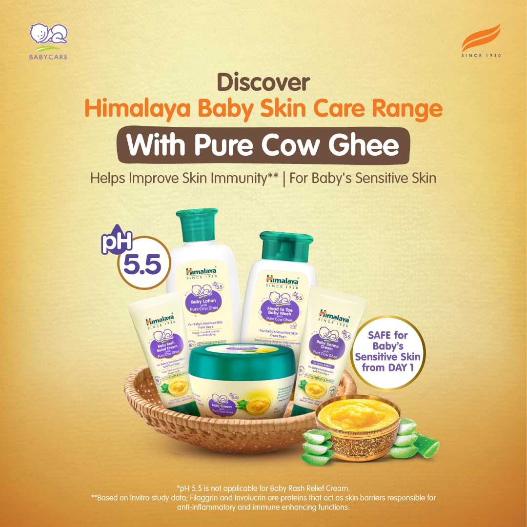 Himalaya Baby Cream with Pure Cow Ghee and Soothing Aloe Vera Extract is specially formulated to moisturize skin all day to nourish protect newborn's sensitive skin and improve the overall skin condition.