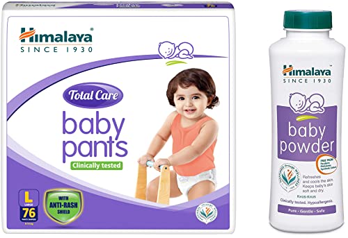 Himalaya Total Care Baby Pants Diapers Large (9-14 kg) 76 Count WhiteHimalaya Total Care Baby Pants are a one-step diaper solution specially designed for comfort protection and total care of baby's skin. Made in an easy-to-wear pant-style design that offers a soft and comfortable fit and are easy to pull on and off.Infused with the goodness of Aloe Vera and Yashada Bhasma Himalaya Total Care Baby Pants offer a protective anti-rash shield that helps reduce the activity of harmful enzymes* and helps prevent diaper rash. Himalaya Total Care Baby Pants have a Super Absorbent Polymer (SAP) layer that absorbs multiple wettings and ensures maximum protection from dampness so that your baby gets undisturbed and restful sleep.Himalaya Baby Powder (400g)Avoid using around baby eyes nose mouth and sensitive areas. Do not sprinkle directly onto baby skin to avoid accidental inhalation.