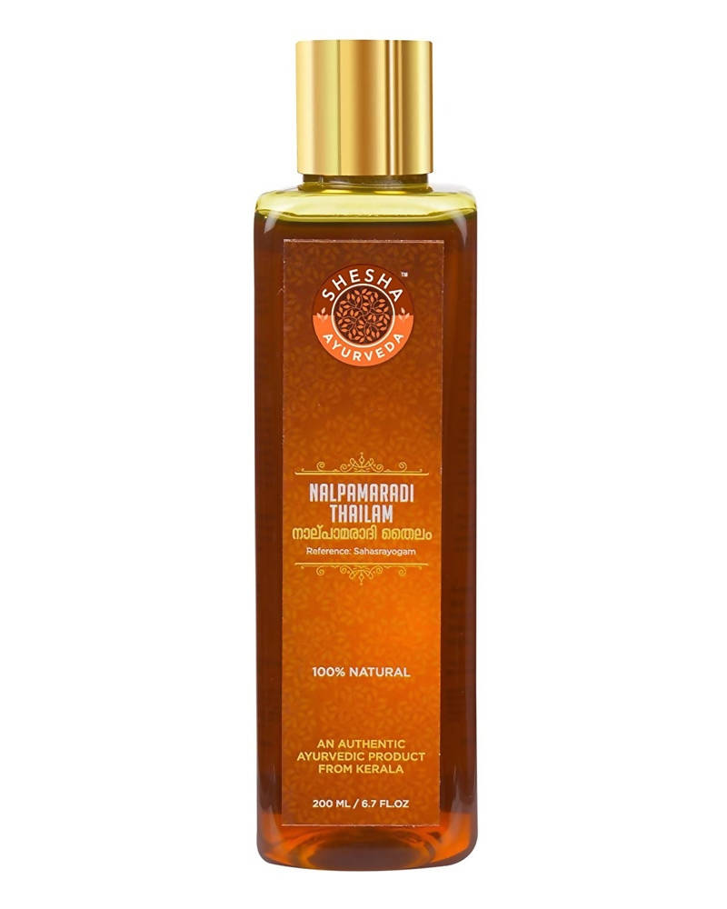 Shesha Ayurveda Nalpamaradi ThailamAbout This Item:Nalpamaradi Thailam is a kind of natural skin illuminator and de-tanning oil suitable for the face and body.It may excellent for skin brightening thereby helps reduce uneven skin tone, pigmentation, acne, scars and skin rashes.Directions For Use:Take the required quantity and apply it all over the face and body. Leave it on for about 20-30 minutes so that it's fully absorbed by skin. Follow up with a warm bath using a mild natural soap or cleanser.Ingredients: Haridra, Parpataka, Indian Banyan Tree Bark, Indian Fig Tree Bark, Peepal Tree or Ashwattha Tree Bark, Plaksha Tree Bark, Manjistha, Haritaki, Indian Gooseberry, Bibhitaka, Vetiver, Pushkarmool, Indian Madder, Aromatic Ginger or Chandramoula, Agarwood in Sesame Oil base.Legal Disclaimer: The product is guaranteed to be 100% genuine. Product images are for illustrative purposes only. Images/packaging/ labels may vary from time to time due to ch