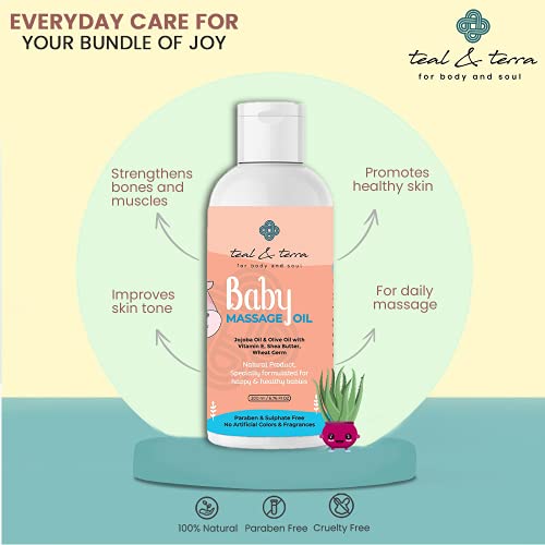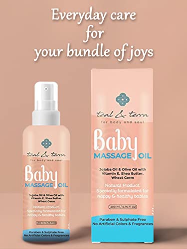 Massages that are healthy and loving are essential for a baby's growth. Choosing the correct blend of oils is essential for a child's growing muscles and bones. By massaging your child you can strengthen your bond with them. Use Teal & Terra's Baby Massage Oil to make it extra special. a blend of premium essential oils to effectively treat your baby's skin and achieve the greatest outcomes. The body is strengthened with olive oil so the baby's muscles are sturdy enough for aerobic activity. It contains wheatgerm oil a natural mood enhancer that eases body tension and promotes relaxation. Additionally it enhances sleep which makes kids happier and more rested! Without any additional chemicals or synthetic additives it is a completely natural oil. Benefits: improved bone density and muscles. healthy moisturised skin. enhances blood flow and sleep. improves the baby's temperament making it cheerful. prevents dry skin. prevents skin from getting sick supple soft skin.