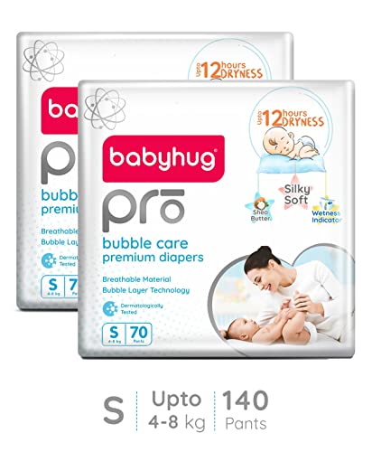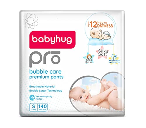 Babyhug Pro bubble care premium pant style diapers are made with a silky soft & breathable material best for your baby's delicate skin. The bubble layer technology provides quick absorption and keeps baby dry for upto 12 hours. These diapers are enriched with shea butter to protect & moisturise baby's skin. The flexible waist band makes them super comfortable while the leak guard keeps potential leakage at bay. A convenient wetness indicator turns from yellow to blue when it is time for a diaper change.